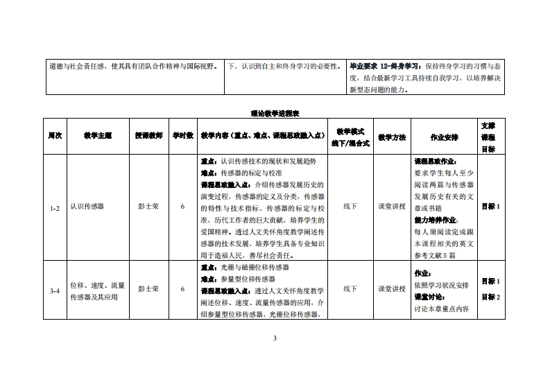 《传感与测量技术》教学大纲课程名称:传感与测量技术课程类别(必修选维):必修课英文名称:Sensors and Detection Technolog型y总学时厘学时/学分:483/3其中实验实瘦学时:12先修课程:大学物理、电工电子技术后续课庭支排自动控制、单片机原理及应用量课时间:1-16周星期四9-11节授课地点:数学楼6411、机电楼401发裸对◆:2023智能制造1班2班开课学佛:粤台产业科技学院任裸微师姓名路:彭士荣/副教授答果时间、地点与方式:1每次课的课前、课间和课后,采用一对一的问答方式:2每次习题课,采用集中讲解方式。课程考核方式:开卷()闭港()课程论文()其它(√)非试卷类报告使用藏材《传感器与检测技术应用》,陈经文、孙东平、王盼盼,人民邮电出版社,ISBN:9787115569196。课程简介:本课程是智能制造专业的基础必修课,以传感器为主,讲述其基本原理和应用技术,系统性介绍传感器的基本知识、传感器组成与分类、传感器的材料及特性、传感器标定与校准、传感检测技术的作用和发展,重点讲解位移、力学、温度、气敏、湿度、光电、视等方面的传感器的工作源理与应用方法。本课程利用项目制作传感器测试装置,搭配Arduino编程对单片机功能进行调试及实物制作,使本课程兼具理论性和实践性。裸容妆学目标及对毕业要求州标点的支撑: