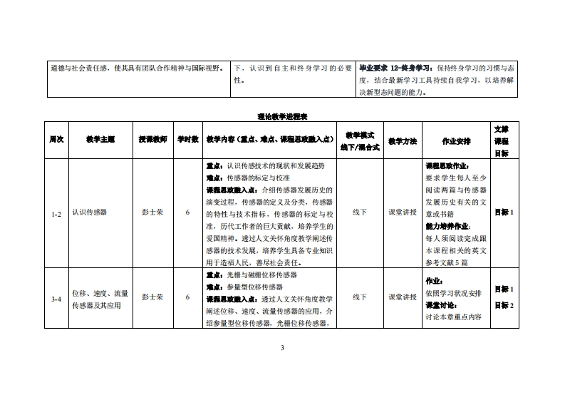 《传威器与检测技术》教学大纲课程名称:传感器与检测技术课程类别(必修选修):处修课英文名称,Sensors and Detection Technology总苹时四苹时/举分:48w3/3其中实验实瘦举时:12先排课程:大学物理、电工电子技术后续课避支推无授课时间:1-16周星期一5~7节提课地点:实314发裸对桌:2022智能制造1班开课学瑰:粤台产业科技学院任课微师姓名济:彭士荣/副教授答果时间、地点与方式:1每次课的课前、课间和课后,采用一对一的问答方式:2每次习题课,采用集中讲解方式。课程考核方式:开卷()闭港()课程论文()其它(√)非试港类报告使用教材《传感器与检测技术应用》,陈经文、孙东平、王盼盼,人民邮电出版社,ISBN:9787115569196。课程衡介:本课程是智能制造专业的基础必修课,以传感器为主,讲述其基本原理和应用技术,系统性介绍传感器的基本知识、传感器组成与分类、传感器的材料及特性、传感器标定与校准、传感检测技术的作用和发展,重点讲解位移、力学、温度、气敏、湿度、光电、视觉等方面的传感器的工作原理与应用方法。本课程利用项目制作传感器测试装置,搭配Arduino编程对单片机功能进行调试及实物制作,使本课程兼具理论性和实践性。课程微学目标及对毕业求州标点的支撑: