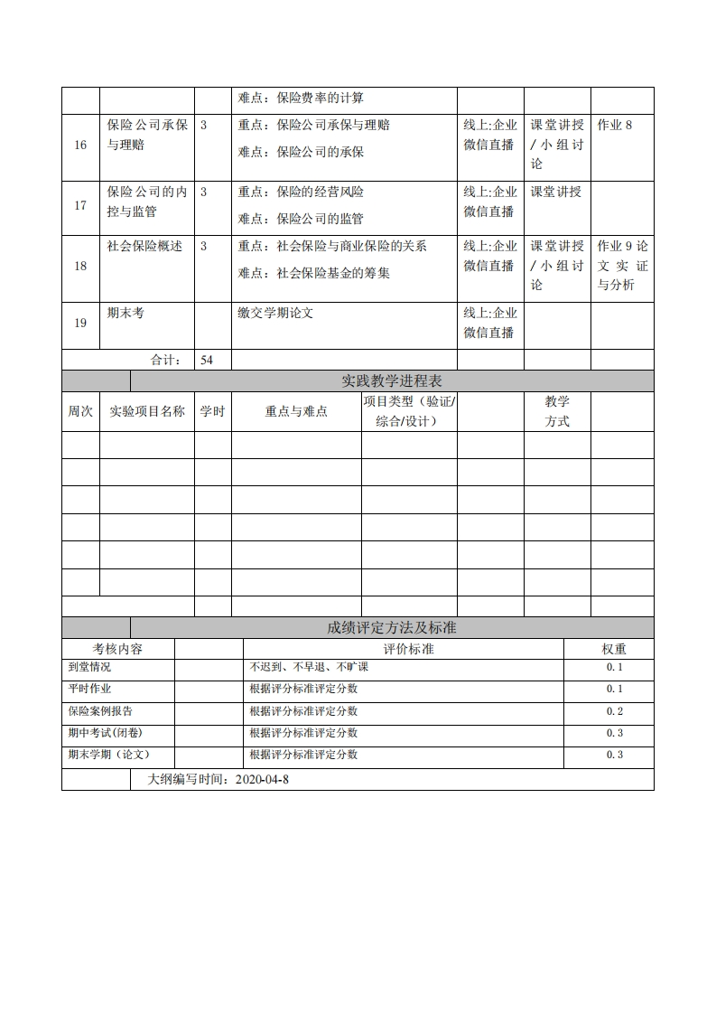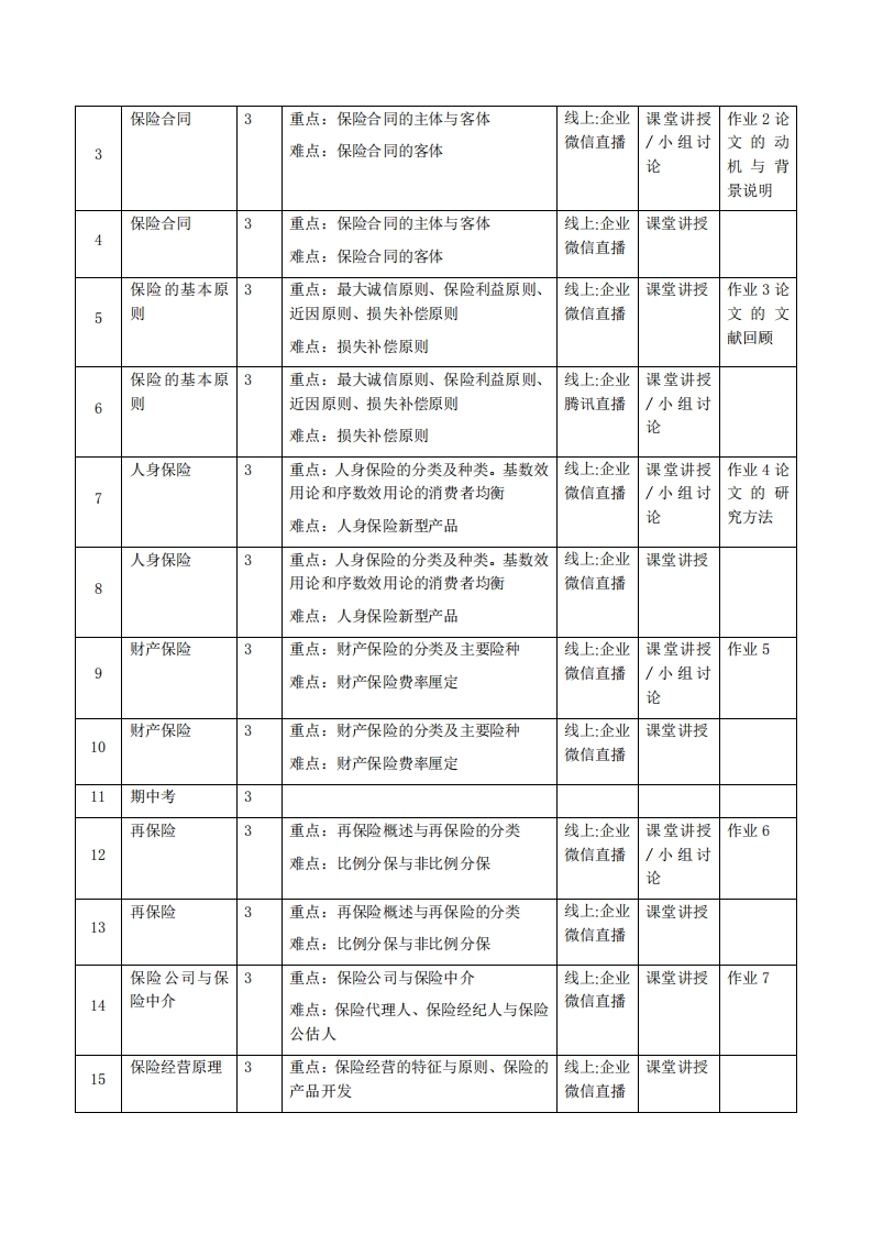 《保险学》课程教学大纲课程名称:保险学课程类别(必修/选修):必修课程英文名称:Insurance总学时/周学时/学分:54/3/3其中实验(实训、讨论等)学时:先修课程:会计学、经济学授课时间:星期三/第子7节/(1-18周)授课地点:企业微信端线上教学授课对象:2018级经济与金融专业开课院系:粤台产业科技学院任课教师姓名/职称:唐志刚/副教授联系电话:158-177-38817Email:604252876@qq.com答疑时间、地点与方式:星期三/5-7节/实验楼/面授课程考核方式:开卷()闭卷()课程论文(√)其它()使用教材:《保险学原理》,唐志刚,西北大学出版社,第一版,2016年1月第1次印刷。教学参考资料:《风险管理与保险、孙祁祥等译、中国社会科学出版社,2013年》课程简介:通过本课程教学,探讨保险制度特性及经营规律,掌握保险的基本理论原则、基本知识与基本技术方法,具备较好的保险承保、理赔能力,保险营销能力以及银行保险的销售能力。课程教学目标本课程与学生核心能力培养之1.掌握风险及风险管理的内容,了解风险的分类间的关联(可多选):2.掌握保险的职能、作用以及保险的主要业务类别。口核心能力1.3.掌握保险经营的特征及其保险业务经营的流程。■核心能力2.口核心能力3.■核心能力4.■核心能力5.■核心能力6.口核心能力7.理论教学进程表周次教学主题教学教学方式时长教学的重点与难点教学手段作业安排保险与风险重点:可保风险、人身保险和财产保险线上:企业课堂讲授作业1的区别微信直播检索论1难点:可保风险与不可保风险文题目的参考论文保险与风险3重点:可保风险、人身保险和财产保险线上:企业课堂讲授的区别微信直播/小组讨难点:可保风险与不可保风险论