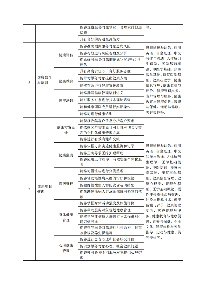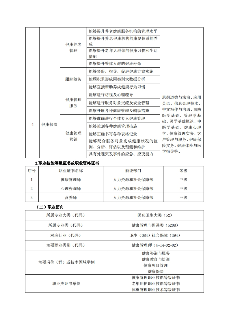 《健康管理》专业人才培养方案一、专业名称及代码专业名称:健康管理专业代码:520801二、入学要求招生对象:高中(中职)毕业生或具有同等学历者。招生类型:文理兼收。三、修业年限三年四、职业面向(一)职业能力分析1.专业服务面向健康管理专业就业部门包括医疗服务机构、健康保险公司、医疗保健和健康管理部门、医院和非医院的健康体检机构、营养咨询公司、心理咨询机构、药店、养生会所、养老院、社区和部队的相关医疗卫生保健机构、政府机关部门、相关教育和研究机构等。主要就业岗位主要从事健康教育、健康指导、卫生保健、卫生信息管理、医疗监督、疾病的预防控制、健康保险、医药服务与管理等岗位的相关工作。2职业岗位与职业能力分析序号工作岗位典型工作任务职业能力支撑课程能够从数据中发现隐性疾病风险思想道德与法治、应用健康资料分能够为就诊治疗提供依据英语、信息处理、中文析解读写作与沟通、医学基础能够为后续健康管理跟进提供有效基础概论、中医学基础、预能够缩短突发疾病的治疗时效防医学基础、健康信息能够帮助服务对象认识疾病的病因及危管理、管理学基础、健险因素康监测与评价、慢性非健康需求能够帮助服务对象确定存在的护理问题传染性疾病管理、健康健康咨询管理能够根据患者需求进行健康教育、康复教育与健康促进、营养与服务保健与健康、健康管理实能够帮助患者进行心理疏导务、客户管理与服务、健康体检与医学指导、针对服务对象正确实施健康教育健康促进运动与健康、美容美能够对患者进行正确检查指导体、专业技能综合实训