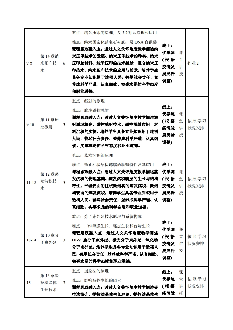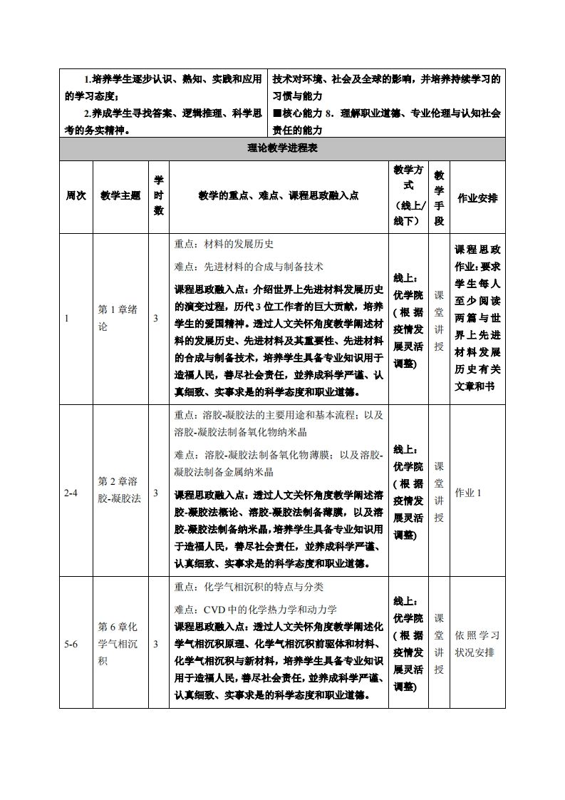 《先进材料与制程技术》教学大纲课程名称:先进材料与制程技术课程类别(必修/选修):选修课程英文名称:Advanced Materials and Process Technology总学时周学时学分:48/3/3其中实验实践学时:先修课程:授课时间:授课地点:授课对象:2018精密制造1班开课学院:粤台产业科技学院任课教师姓名职称:林春佑副教授答疑时间、地点与方式:课前、课间和课后;救室;网络、交流课程考核方式:开卷()闭卷(√)课程论文()其它()使用教材:《先进材料合成与制备技术(第二版)》,李爱东,科学出版社,ISBN:9787030606105教学参考资料:自编材料课程简介:本课程是机城设计制造及其自动化专业的专业课,以近年来相对应用成熟的先进材料为基础,透过材料合成与制备和加工的角度,讲述其基本原理和方法,並说明相关制造工艺制程设备的机械设计及自动化技术。课程所选材料及其合成与制备和加工方法,包括:(1)薄膜材料之溶胶凝胶法、化学气相沉积法、磁控溅射法、蒸发沉积法、原子层沉积法、团簇束流沉积法、澈光脉冲沉积法、分子束外延法等;(2)纳米材料之水热和溶剂热法、徽波合成法、超声电化学法等:(3)晶体材料之晶体生长提拉法;(4)精细加工材料之原子层刘蚀法、纳米压印法等;(5)增层材料之3D打印法:(6)自组装材料之DNA自组装法。课程内容涉及材料、机械、钠米工程等多个交叉学科,采取深入浅出救学方式,使本课程兼具理论性和实践性。课程教学目标本课程与学生核心能力培养之间的关联授课对象为一、知识目标:理工科专业学生的课程填写此栏):1.了解先进材料及其应用;口核心能力1.应用数学、基础科学和机械设计制造2.掌握先进材料合成与制备和加工的基及其自动化专业知识能力本原理和方法。口核心能力2.设计与执行机械设计制造及其自动化3.认识先进材料合成与制备和加工之相专业相关实验,以及分析与解释相关数据的能力关制造工艺制程设备■核心能力3.机械设计制造及其自动化领域所需技二、能力目标:能、技术以及实用软硬件工具的能力1熟知先进材料合成与制备和加工的应■核心能力4.机械设计制造及其自动化系统、零部用;件或工艺流程的设计能力2.认识先进材料近年所发展的合成与制■核心能力5.项目管理、有效沟通协调、团队合作备和加工新技术。及创新能力3.掌握先进材料合成与制备和加工之相■核心能力6.发摄、分析与解决复杂机械设计制造关设备的机械设计及自动化技术。及其自动化问题的能力三、素质目标:■核心能力7,认识科技发展现状与趋势,了解工程