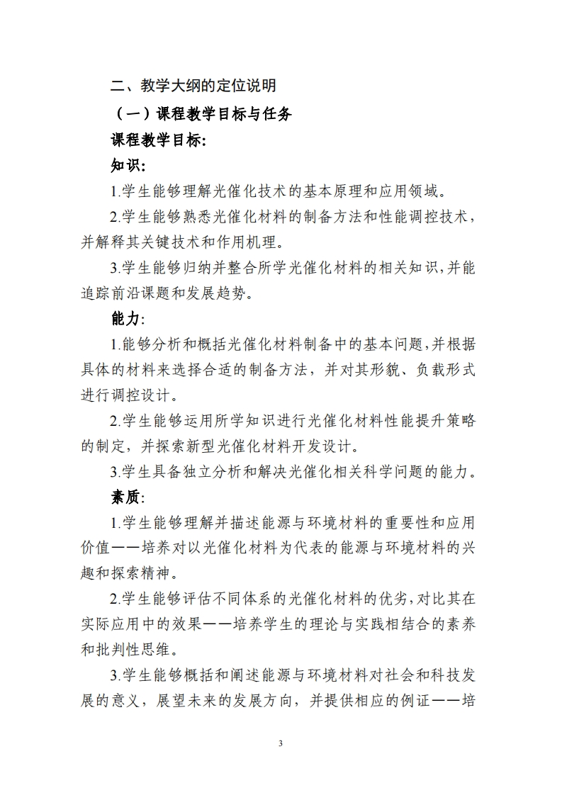 《光催化技术与应用》课程教学大纲一、课程概况课程名称光催化技术与应用课程号1412035Introduction to Photocatalysis:课程英文名称From Basic Science to学时/学分36/2Applications课程性质选修适用专业材料化学课程负责人刘斌教学团队王希成教材:《光催化:环境净化与绿色能源应用探索》,朱永法等著,化学工业出版社,2015年主要参考书:1.《光催化材料及其在环境净化中的应用》,张彭义等著,化学工业出版社,2016年选用散材及2.《新型纳米光催化材料:制备、表征、理论及应用》,潘春旭等著,科学出版社,2017年参考书目3.《图解光催化技术大全》,(日)桥本和仁,藤岛昭主编,邱建荣朱从善译,科学出版社,2007年4.《Photocatalysis?》,C.A.Bignozzi主编,Springer,.20115.Heterogeneous Photocatalysis Using Inorganic Semiconductor Solids,Umar IbrahimGaya著Springer,2013课程简介:《光催化技术与应用》是材料化学专业的专业选修课程,课程以光催化技术的基础理论为主线,结合材料科学的前沿研究,探讨各种光催化材料的制备、性能及其应用。内容包括二氧化钛纳米材料的制备及其光催化性能提升技术,复合氧化物及其在环境净化、新能源领域中的应用,以及新型光催化材料的探索和表征方法。该课程的开设,有助于增强学生对光催化材料为代表的能源和环境材料相关研究进展的了解,加深学生对功能材料的结构设计、性能表征及其实际应用之间相辅相成关系的理解,激发学生的探索精神,为他们在后续材料领域的工作和研究中奠定基础。课程目标(Course Objectives,,CO)理解光催化技术的基本原理和应用领域。知识目标(C01)熟悉光催化材料的制备方法和性能调控技术。了解光催化材料领域前沿议题和发展趋势。能够分析和概括光催化材料制备中的基本问题,并根据具体的材料来选择合适的制备方法,并对其形貌、负载形式进行调控设计。能力目标(C02)运用所学知识进行光催化材料性能提升策略的制定,并探索新型光催化材料开发设计。具备独立分析和解决光催化相关科学问题的能力。培养对以光催化材料为代表的能源与环境材料的兴趣和探索精神。认识光催化材料在现代材料科学中的重要性及其科学性和应用价值。素质、情感价值观目标(CO3)培养对能源与环境材料研究的热情和对未来发展的期待。培养学生的团队合作精神和批判性思维,使其能够在团队中有效沟通和协作。