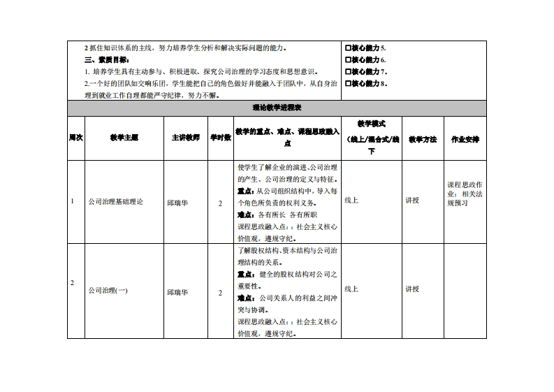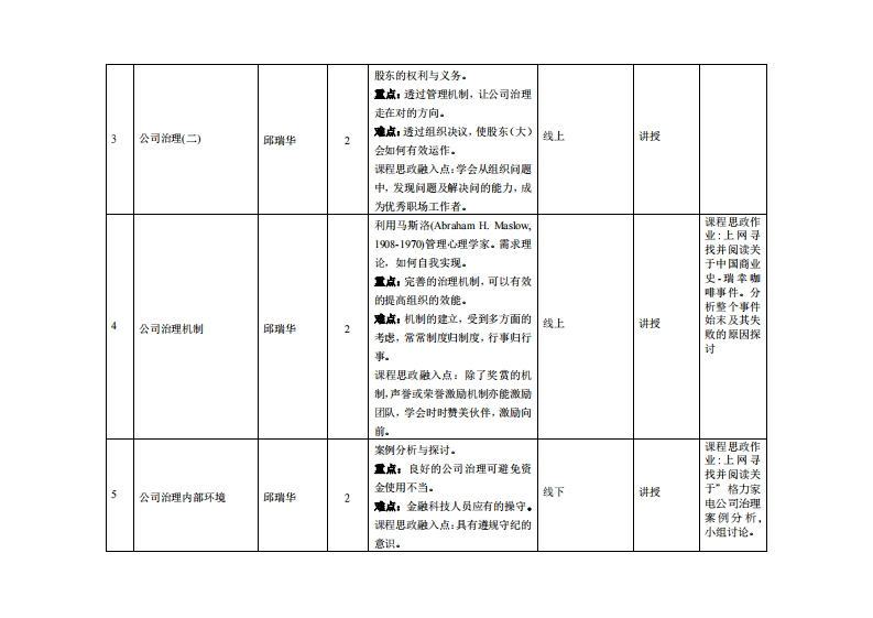 《公司治理》教学大纲课程名称:公司治理课程类别(必体选作):选修课程英文名赫:Corporate Governance总学时周学时学分:3222其中实险实玻学时,16先无修课程:无接裸时间:期二(靠一节至靠二节)授课地点:实305提课对橡:20服经济与童耻系2班开裸学愧:事合产业科技学洗任课敏师姓名职称:邱华讲师答疑时间、地点与方式:课程特核方式:开港()闭卷()课程论文()■其它(报告)使用微村:《公司治理与内薄控制,胡院明,许萍公司泊理与内部控制北京:人民邮电出版社2014。做学事考责料:1.Case Study。2.相关法规(公司法)。课超简介公司治理与内部控制是企业平稳和持续发展的两道保障机制,它既有很强的理论性,又是管理层面上很现实的实践问愿。随着全球经济一体化的发展和世界经济环境的变化,各国的公司治理与内部控制实践也在发生着深刻的变革,越来越多的投资者和公司的决策者认识到,良好的公司治理与内部控制是企业增强竟争力和提高经营绩效的必要条件,保护所有者及其他利害相关者,保证现代市场体系有序、高效运行的微观基础。本课程主要介绍公司治理与内部控制的基本概念和理论,公司治理结构,公司治理机制,公司治理的模式内部控制的基本概念、控制架构、控制评价和控制设计。课程敏举目标本课程与苹生核心能力培养之间的关联授裸一、知识目标:对康为理工科专业苹生的课容填再此栏):L使学生能够掌握公司治理与内部控制的基本概念和理论。口核心能力1.2掌握公司治理与内部控制的框架模式和设计方法。口枝心能力2.二、能力目标:口核心能力3.1.学会公司组织运作与管理之重要性。口核心能力4
