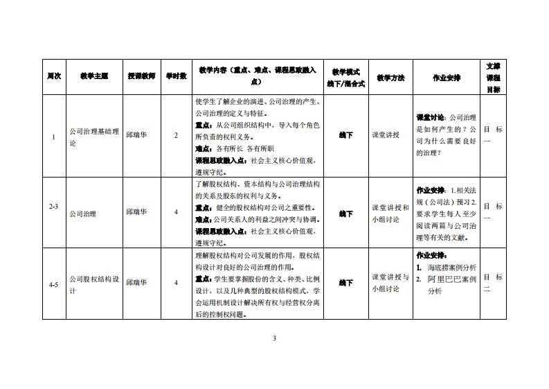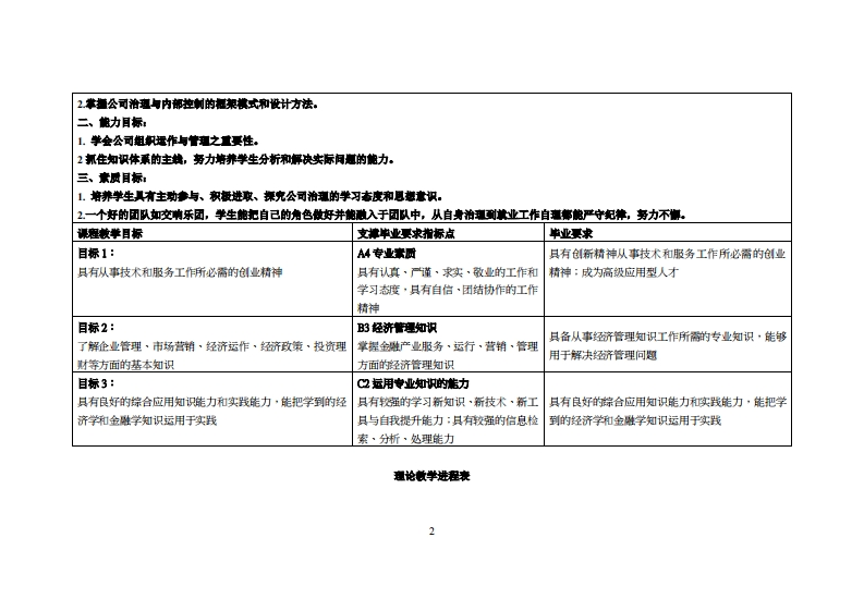 《公司治理)教学大纲课避名称:公司油建课忍类别(必修选修)事选修课程英文名称:Corporate Govemance总学时周学时学分:3222其中实险实液学时,4先修课是:管迎学后续课程支撑毕业论文授课时间:2-17周星期二3-4节授课地点:实314课对律:21额经济与金数系二班开裸学陕:粤合产业荆妆学陕任课柳姓名淋:邱弹华进视答展时间、地点与方式:实险楼212室课程考核方式:开卷()闭卷()课程论文()其它()使用微村《公司治》,马连播:中国人民大学出版社(第3版)2022年09月妆学事考资料:1.Ca5靴Sud少y2相关法枫公司法3.文净考度料课避情介:公司治理与内部控制是企业平稳和持续发展的两道保障机制,它既有很强的理论性,又是管理层面上很现实的实践问题。随着全球经济一体化的发展和世界经济环境的变化,各国的公司治理与内部控制实践也在发生着深刻的变革,越来越多的投资者和公司的决策者认识到,良好的公司治理与内部控制是企业增强竟争力和提高经营绩效的必要条件,保护所有者及其他利害相关者,保证现代市场体系有序、高效运行的微观基础。通过本课程的学习,使学生比较全面、系统的掌握公司治理的基本理论、基本知识和基本方法,提高认识和运用公司治理的一般理论、原则和规律,正确分析和解决公司治理实际问题的能力,以便更好地适应现代公司治理工作的需委和现代企业管理者素质提高的需委;对于日后就业跟创业有较大的帮助。课程数学目标及对毕业要求指标点的文排:一、知识目标:1使擎生能够掌漫公司治理与内邮控制的基本振老和理论。