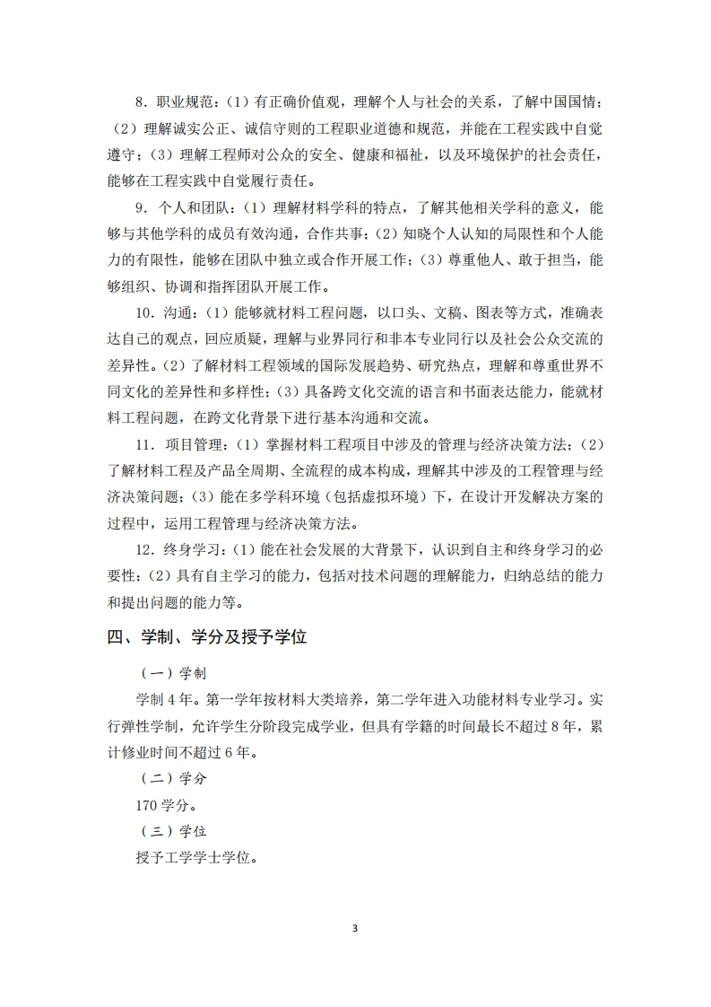 兰州大学材料与能源学院功能材料专业人才培养方案(2021年修订)一、专业简介功能材料专业面向材料在信息、能源、生命健康、生态环境保护等领域中的功能性应用,培养学生掌握先进功能复合材料的理论、制备、结构、性能,理解材料结构对性能和服役行为的影响。功能材料专业培养学生具有健康体魄、人文底蕴、工程意识、国际视野的中国特色社会主义建设者和接班人,要求学生掌握数学、物理、化学等自然科学知识,计算机、机械制图、电工基础、材料加工、工程伦理等工程基础知识和技能,功能复合材料及相关先进材料的专业知识和技能,深入了解专业实验室和企业生产线,并能分析和解决相关实际问题。近五年毕业生有40-60%攻读研究生,其他到有机高分子、金属、陶瓷、半导体等相关新材料行业以及石油、化工、医药、能源、建筑等相关新工科领域从事研发或管理工作。功能材料专业(080412T)属工学学科门类(08)材料类(0804),完成本专业学业,并符合学位授予规定者,授予工学学士学位。二、专业培养定位与目标(一)培养定位宽厚基础,人文情怀,工程意识,国际视野,精英教育(二)培养目标培养具有健康体魄、人文底蕴、工程意识、国际视野,理论基础与专业技能扎实的中国特色社会主义建设者和接班人,在材料相关领域从事研发或管理工作的研究型、引领型人才。三、基本要求1.工程知识:(1)掌握数学、物理、化学等自然科学知识,计算机、机械制图、电工基础、材料加工、工程伦理等工程基础知识,材料的制备、结构表征、性能测试等专业知识:(2)能够利用数学、物理、化学等自然科学知识,针对具