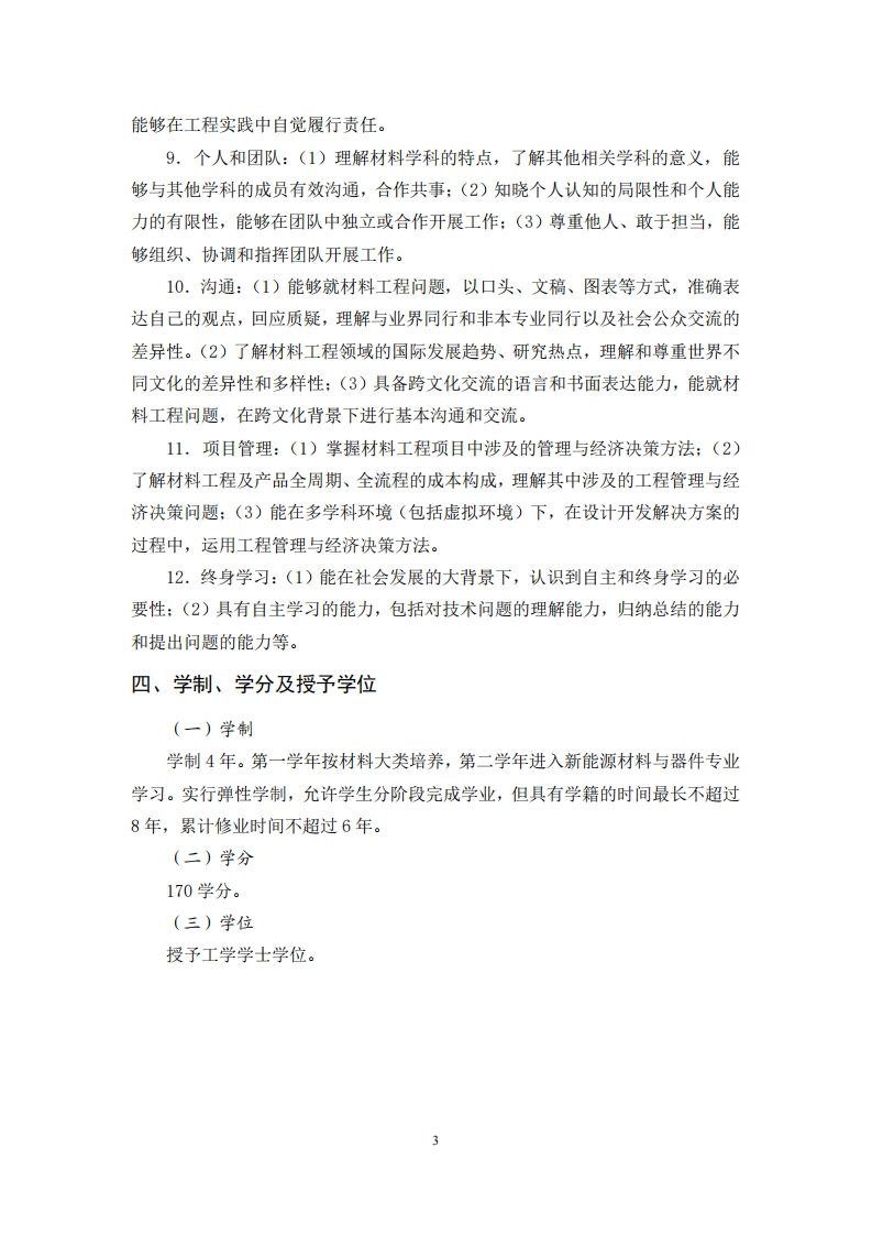 兰州大学材料与能源学院新能源材料与器件专业人才培养方案(2021年修订)一、专业简介新能源材料与器件专业面向国家新能源材料领域的战略发展和“双碳”目标实现的需求,培养学生从材料学原理出发,探索新能源材料及其器件的制备、结构设计、性能表征以及理解材料结构和性能对器件性能和使役行为的影响。新能源材料与器件专业培养具有健康体魄、人文底蕴、工程意识、国际视野的中国特色社会主义建设者和接班人,要求学生掌握数学、物理、化学等自然科学知识,计算机、机械制图、电工基础、材料加工、工程伦理等工程基础知识和技能,半导体光伏材料、储能材料及其器件的制备、结构表征、性能测试等专业知识和技能,深入了解专业实验室和企业生产线,并能分析和解决相关实际问题。新能源材料与器件专业(080414T)属工学学科门类(08)材料类(0804),完成本专业学业,并符合学校学位授予规定者,授予工学学士学位。二、专业培养定位与目标(一)培养定位宽厚基础,人文情怀,工程意识,国际视野,精英教育(二)培养目标培养具有健康体魄、人文底蕴、工程意识、国际视野,理论基础与专业技能扎实的中国特色社会主义建设者和接班人,在材料相关领域从事研发或管理工作的研究型、引领型人才。三、基本要求1.工程知识:(1)掌握数学、物理、化学等自然科学知识,计算机、机械制图、电工基础、材料加工、工程伦理等工程基础知识,材料的制备、结构表征、性能测试等专业知识:(2)能够利用数学、物理、化学等自然科学知识,针对具体的材料对象建立数学模型和物理模型:(3)能够将专业知识和模型方法用于推演、分析、求解材料工程问题。2.问题分析:(1)能够运用自然科学原理,识别和判断材料相关复杂问题