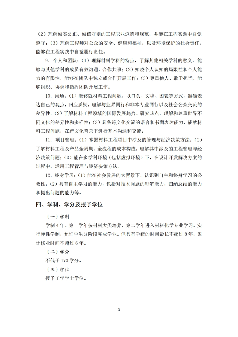 兰州大学材料与能源学院材料化学专业人才培养方案(2021修订)》一、专业简介材料化学专业面向先进功能材料和结构材料,培养学生从化学原理出发,探索材料的成分、制备工艺对材料结构的影响,理解材料结构对性能和使役行为的影响。材料化学专业培养具有健康体魄、人文底蕴、工程意识、国际视野的中国特色社会主义建设者和接班人,要求学生掌握数学、物理、化学等自然科学知识,计算机、机械制图、电工基础、材料加工、工程伦理等工程基础知识和技能,结构材料和功能材料的制备、结构表征、性能测试等专业知识和技能,深入了解专业实验室和企业生产线,并能分析和解决相关实际问题。近五年毕业生有40-60%攻读研究生,其他到金属、陶瓷、半导体等相关新材料行业以及化工、建筑、能源等相关新工科领域从事研发或管理工作。材料化学专业(080403)属工学学科门类(08)材料类(0804),完成本专业学业,并符合学位授予规定者,授予工学学士学位。二、专业培养定位与目标(一)培养定位宽厚基础,人文情怀,工程意识,国际视野,精英教育(二)培养目标培养具有健康体魄、人文底蕴、工程意识、国际视野,理论基础与专业技能扎实的中国特色社会主义建设者和接班人,在材料相关领域从事研发或管理工作的研究型、引领型人才。三、基本要求1.工程知识:(1)掌握数学、物理、化学等自然科学知识,计算机、机械制图、电工基础、材料加工、工程伦理等工程基础知识,材料的制备、结构表征、性能测试等专业知识:(2)能够利用数学、物理、化学等自然科学知识,针对具体的材料对象建立数学模型和物理模型:(3)能够将专业知识和模型方法用于推