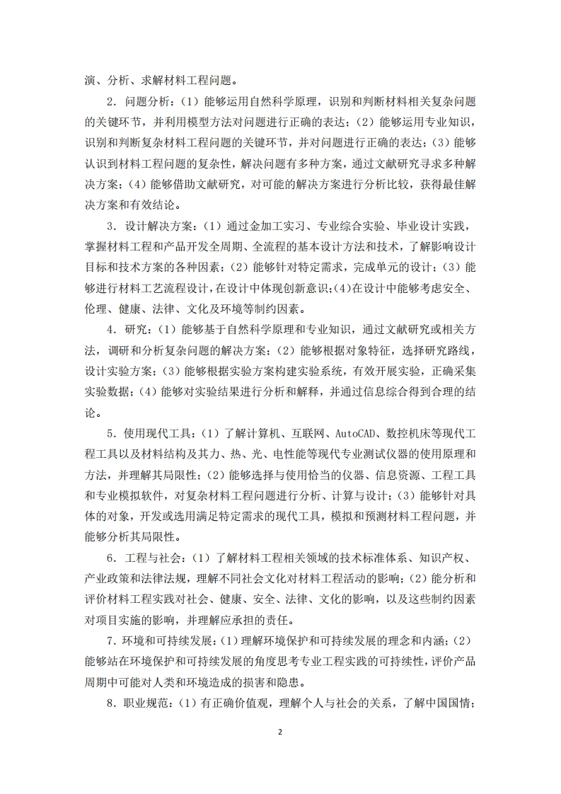 兰州大学材料与能源学院材料物理专业人才培养方案(2021年修订)一、专业简介材料物理专业面向先进功能材料和结构材料,培养学生从物理学原理出发,探索材料的成分、制备工艺对材料结构的影响,理解材料结构对性能和使役行为的影响。材料物理专业培养具有健康体魄、人文底蕴、工程意识、国际视野的中国特色社会主义建设者和接班人,要求学生掌握数学、物理、化学等自然科学知识,计算机、机械制图、电工基础、材料加工、工程伦理等工程基础知识和技能,结构材料和功能材料的制备、结构表征、性能测试等专业知识和技能,深入了解专业实验室和企业生产线,并能分析和解决相关实际问题。近五年毕业生有40-60%攻读研究生,其他到金属、陶瓷、半导体等相关新材料行业以及化工、建筑、能源等相关新工科领域从事研发或管理工作。材料物理专业(080402)属工学学科门类(08)材料类(0804),完成本专业学业,并符合学位授予规定者,授予工学学士学位。二、专业培养定位与目标(一)培养定位宽厚基础,人文情怀,工程意识,国际视野,精英教育(二)培养目标培养具有健康体魄、人文底蕴、工程意识、国际视野,理论基础与专业技能扎实的中国特色社会主义建设者和接班人,在材料相关领域从事研发或管理工作的研究型、引领型人才。三、基本要求1.工程知识:(1)掌握数学、物理、化学等自然科学知识,计算机、机械制图、电工基础、材料加工、工程伦理等工程基础知识,材料的制备、结构表征、性能测试等专业知识:(2)能够利用数学、物理、化学等自然科学知识,针对具体的材料对象建立数学模型和物理模型:(3)能够将专业知识和模型方法用于推