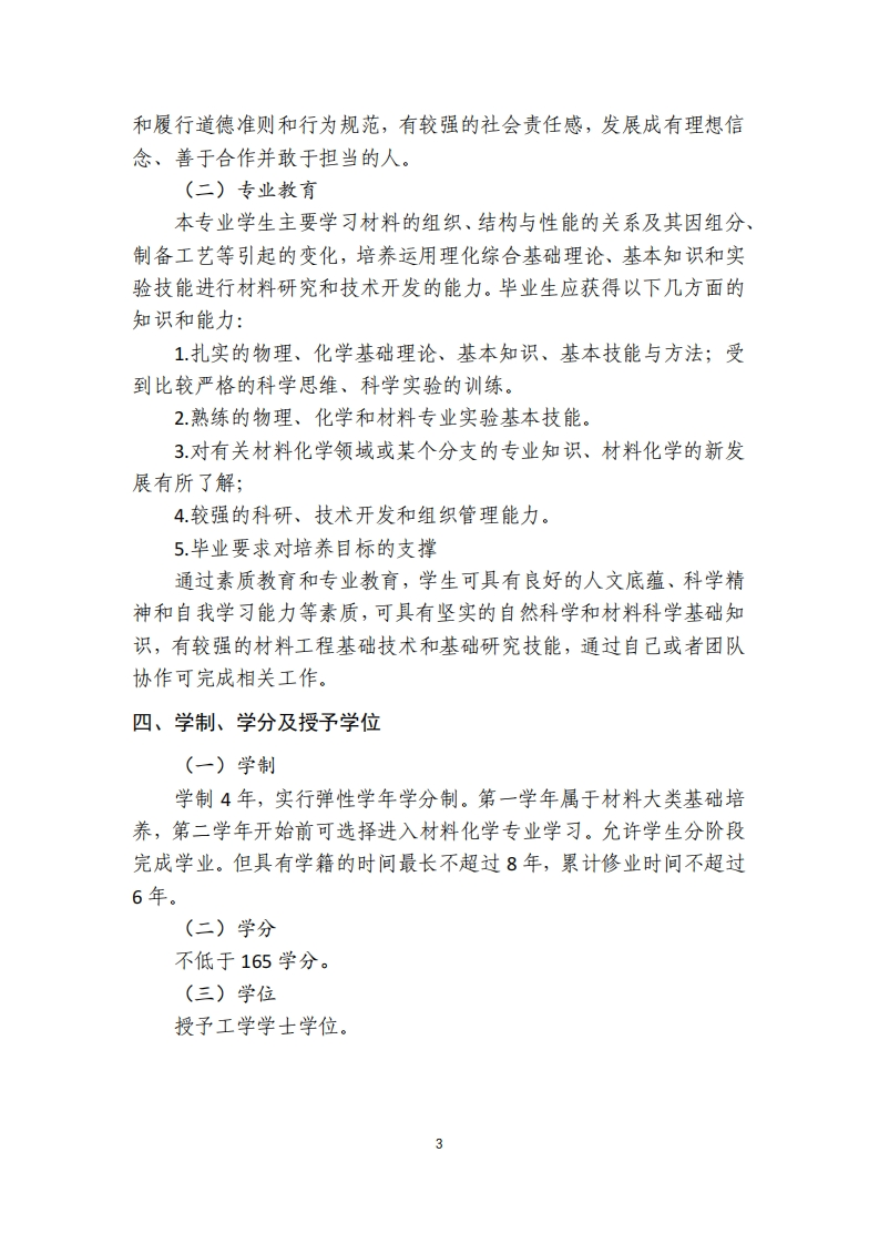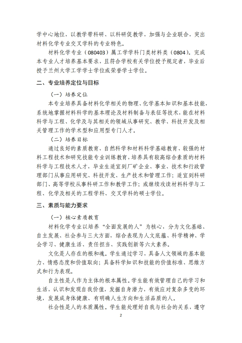 兰州大学物理科学与技术学院材料化学专业人才培养方案(2019试行版)一、专业简介材料化学是材料科学的一个分支,主要研究材料在制备、生产、应用和废弃过程中的化学性质,范围涵盖整个材料领域,包括无机和有机的各类应用材料的化学性能。材料化学涉及的领域极为广泛,其品种繁多,形式各异。材料又是基础科学和工程科学融合的产物,随着科学技术的发展,原来各类相对独立的材料,已经相互渗透,相互结合,多学科的交叉是材料科学与技术的重要特征。材料化学专业主要的研究范畴是材料在制备、使用过程中涉及到的化学过程、材料性质的测量,如陶瓷材料在烧结过程中的变化、金属材料在使用过程中的腐蚀现象、冶金过程中条件的控制对产品的影响等,是根据材料的基本理论和方法对工业生产中与化学有关的问题进行应用基础理论和方法的研究以及实验开发研究的一门学科。材料化学作为一个学科专业的提出,源自国民经济的发展和对应用型人才需求的增加。1987年在国家教委修订的全国理科专业目录中,在化学学科中增设了材料化学、环境化学、食品化学等应用性和边缘交叉学科专业。1990年7月,全国高等学校理科教育座谈会上提出了把多数理科毕业生培养成应用型理科人才的教育方针。1992年3月又颁布了材料化学专业的基本培养规格和教学基本要求,以有利于将多数理科化学毕业生培养成应用性人才,这一重大改革对促进材料化学教育的发展起到了巨大的推动作用。1994年,针对国民经济建设中对应用性人才需求的增加,在原兰州大学材料科学系材料化学教研室基础上于成立了材料化学交叉学科专业,并于1995年开始招生,学制四年,学生毕业授予理学学士学位,2010年被列为国家级高等学校特色专业建设点。材料化学专业以培养具有坚实的化学与物理基础,掌握广泛的材料科学专业知识,拥有较强的实验动手能力和一定创新意识的“厚基础、宽口径、重应用、能创新”的材料化学专业人才为目标,坚持教1