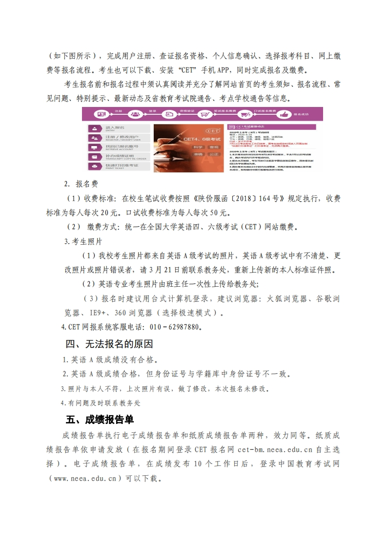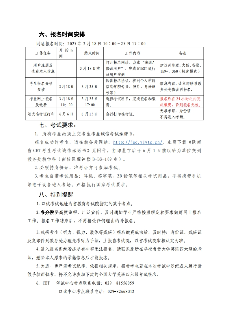 关于做好2025年上半年英语四六级考试报名工作的通知各二级学院:根据教育部教育考试院文件通知,2025年上半年全国大学英语四、六级考试笔试(以下简称CET笔试)将于6月14日在我校南校区举行。报名工作在全国大学英语四、六级考试官网报名系统(https://cet-bm.neea.edu,cn)上进行,英语四、六级考试报名工作有关事项通知如下:一、考试科目、时间及地址1、笔试考试时间日期(6月14日)考试种类考试代码考试时间上午英语四级考试(CET4)19:00-11:20下午英语六级考试(CET6)215:00-17:252、口试考试时间英语四级口语考试(CET-SET4)考试时间为5月24日,英语六级口语考试(CET-SET6)考试时间为5月25日,考试地址为省教育考试院指定的以下8所口语考点中某考点:西安交通大学、西北工业大学、西安电子科技大学、西北农林科技大学、长安大学、西安建筑科技大学、西安工业大学、西安翻译学院。各口语考点根据设置的机位数量接受报名,报满为止。。3.笔试考试地址:杨凌职业技术学院南校区二、报名资格1.在籍在校学生英语A级成绩合格;英语专业2022级、2023级学生。2.2024级三年制学生(高职)、各类函授生、非在校生一律不得报考。3.CET4成绩≥425分的考生方可报考CET6。4.CET4、CET6成绩≥425分的考生,不得再次报考相同级别的考试。5.CET-SET4/6口语报考资格为:完成对应级别笔试科目报考的考生,即完成本次CET4笔试报名后可报考CET-SET4,完成本次CET6笔试报名后可报考CET-SET6.三、报名方法和程序及费用1.报名方法和程序考生自行登录全国大学英语四、六级考试(CET))官方网址,点击相应栏目进行报名