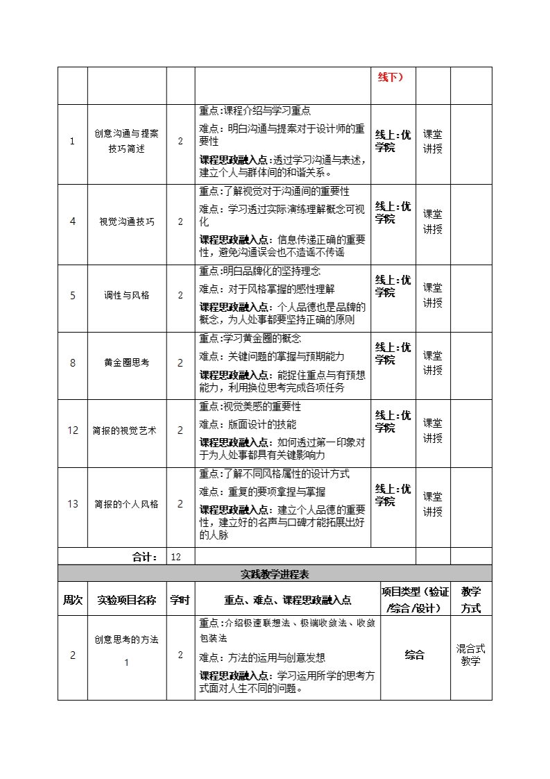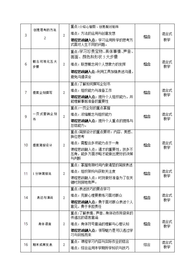 《创意沟通与提案技巧》教学大纲课程名称:创意沟通与提案技巧课程类别(必修选修):必修课程英文名称:Creative communication and proposal skills总学时/调学时学分:3222其中实验实践学时:20先侈课程:无授课时间:周五第1-2尚授课地点:实验楼217授课对像:2018级多煤体设计系开课学院:皂台产业科技学院任课教师姓名职称:陈维钟副授答疑时间、地点与方式:课程考核方式:开卷()闭卷()课程论文()其它(√)使用敬材:教学多考资料:课程简介:设计工作者除了专业工具的学习外,具有创造性思维与有效的沟通也是设计工作者最重要最根本的技能;如何把自己的构想与创意成功传递贝侧需要有良好的耒达能力与能善用提案工具.本课程将针对设计师提升自己的创造性思维与加强他人沟通,进而能成功提案的能力.课程教学日标本课程与学生核心能力一、知识目标:培养之间的关联授课对1.了解掌握创造性思维与沟通的方式与种类。象为理工科专业学生的课程填写此栏):2.学习操作各项提案工具■核心能动1.3掌握表达陈述与提案技巧。■核心能动2.二、能力目标:■核心能劭3.1.熟,练掌握创意沟通的方式;■核心能动4.■核心能动5.2.熟练操作各项提案工具,能制作出完整简报提案。■核心能动6.3.熟练提案技巧与表达要点口核心能动7.三、素质目标:口核心能动8.1.提升创造力与提升沟通技能,培养具同理心,具团队意识的人才。2.养成理论联系实际、结合理性与感性的综合运用、培养良好的观察能力、追求美感的良好态度和职业道德。理论教学进程表学时周歌教学主爱教学的重点、难点、课程思融入点教学纺式教学手数作业安排(线上H段
