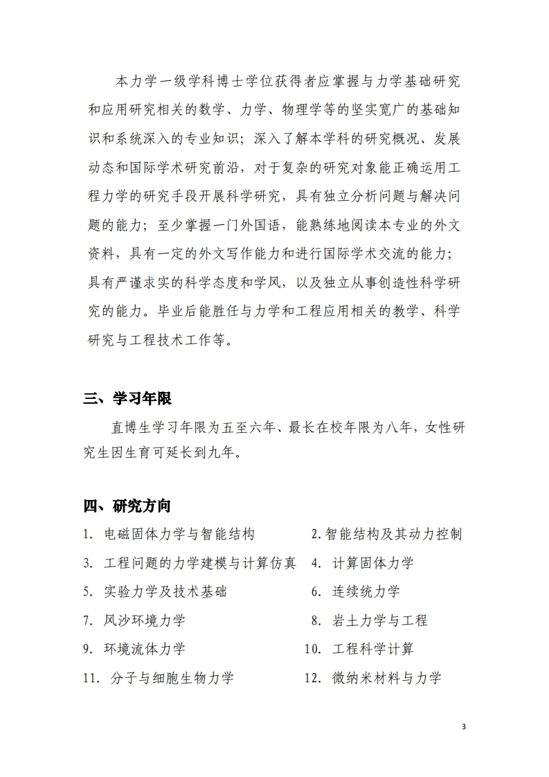 力学(一级学科)直接攻读博土研究生培养方案代码:080100(Mechanics)一、学科概况力学是研究物体变形和运动规律的学科,与国民经济和国防建设有着直接的密切的关系,在航空、航天、机械、船舶、仪器仪表、建筑、桥梁、岩土、地球物理勘探、水利、冶金、材料、能源、交通、武器装备等工程结构的设计与制造中有着广泛的应用。力学既具有理论性严密的基础学科特征,又具备广泛工程应用的技术学科特点,是联系纯基础科学与工程科学的桥梁。本力学学科始建于1958年,在长期的办学和学科建设中逐步形成了较为完整的人才培养体系。现拥有固体力学国家重点学科(2007)、力学一级学科甘肃省重点学科(2006),力学一级博士学位授权点(2010),其中的固体力学二级学科博士点为国家首批批准的授权点(1981)。此外拥有力学一级学科博士后科研流动站(2003)和力学一级学科硕士学位授权点(2006);“理论与应用力学”本科专业的甘肃省人才培养基地(2006)和教育部高校特色专业建设点(2009)。有以本学科为主要依托的西部灾害与环境力学教育部重点实验室和特殊功能材料与结1