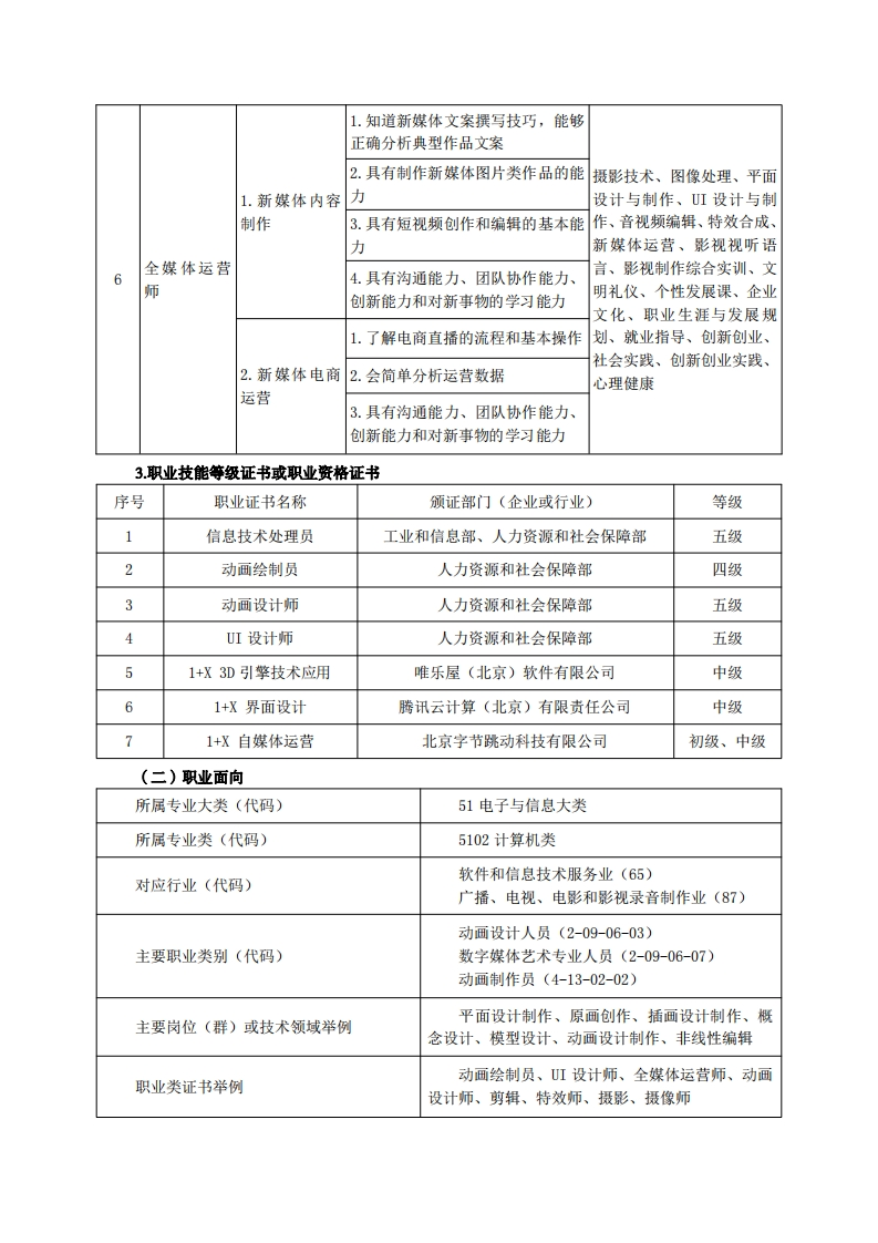 《动漫制作技术》专业人才培养方案一、专业名称及代码专业名称:动漫制作技术专业代码:510215二、入学要求招生对象:高中(中职)毕业生或具有同等学力者。招生类型:文理兼收。三、修业年限三年。四、职业面向(一)职业能力分析1.专业服务面向本专业面向传媒、设计、游戏等行业的企事业单位,主要从事动漫项目策划、二维动漫创作、三维动画创作、动画特效制作、原画设计、摄影摄像、影视剪辑、视觉传达设计、虚拟现实开发等工作。2.职业岗位与职业能力分析序号工作岗位典型工作任务职业能力支撑课程1.能够熟练使用WORD、EXCEL等办公自动化相关软件,具有办公软件信息处理技术、写作与沟1.办公自动化的基本操作能力通、应用数学、应用英语、1办公室文秘操作及日常办2.具有办公文档编撰处理能力思想道德与法治、文明礼公文档撰写3.具有沟通能力、团队协作能力、仪、个性发展课、心理健康创新能力1.具有人物原画创作的基本能力动画素描、设计速写、设计色彩、素描与速写综合实2美术设计师1.原画设计2.具有场景原画创作的基本能力训、文明礼仪、个性发展课、3.具有沟通能力、团队协作能力、心理健康创新能力1.具备色彩的采集、重构和情感表设计色彩、信息处理技术、1.图形图像处现能力图像处理、平面设计与制理2.熟悉Photoshop、.Illustrator等作、UI设计与制作、特效合UI设计师图形图像处理软件的使用成、I设计制作综合实训、2.平面设计制1.熟悉平面设计基础网页设计与制作、文明礼仪、个性发展课、企业文化、作2具有试用平面设计软件创作平面职业生涯与发展规划、就业