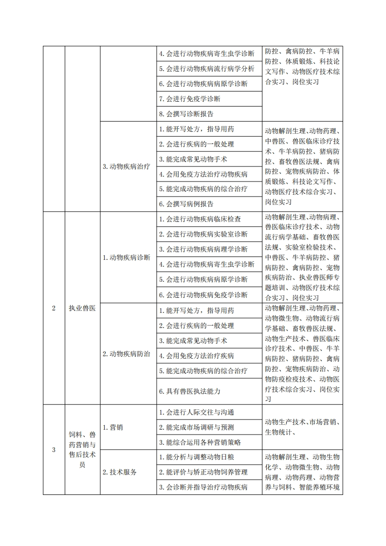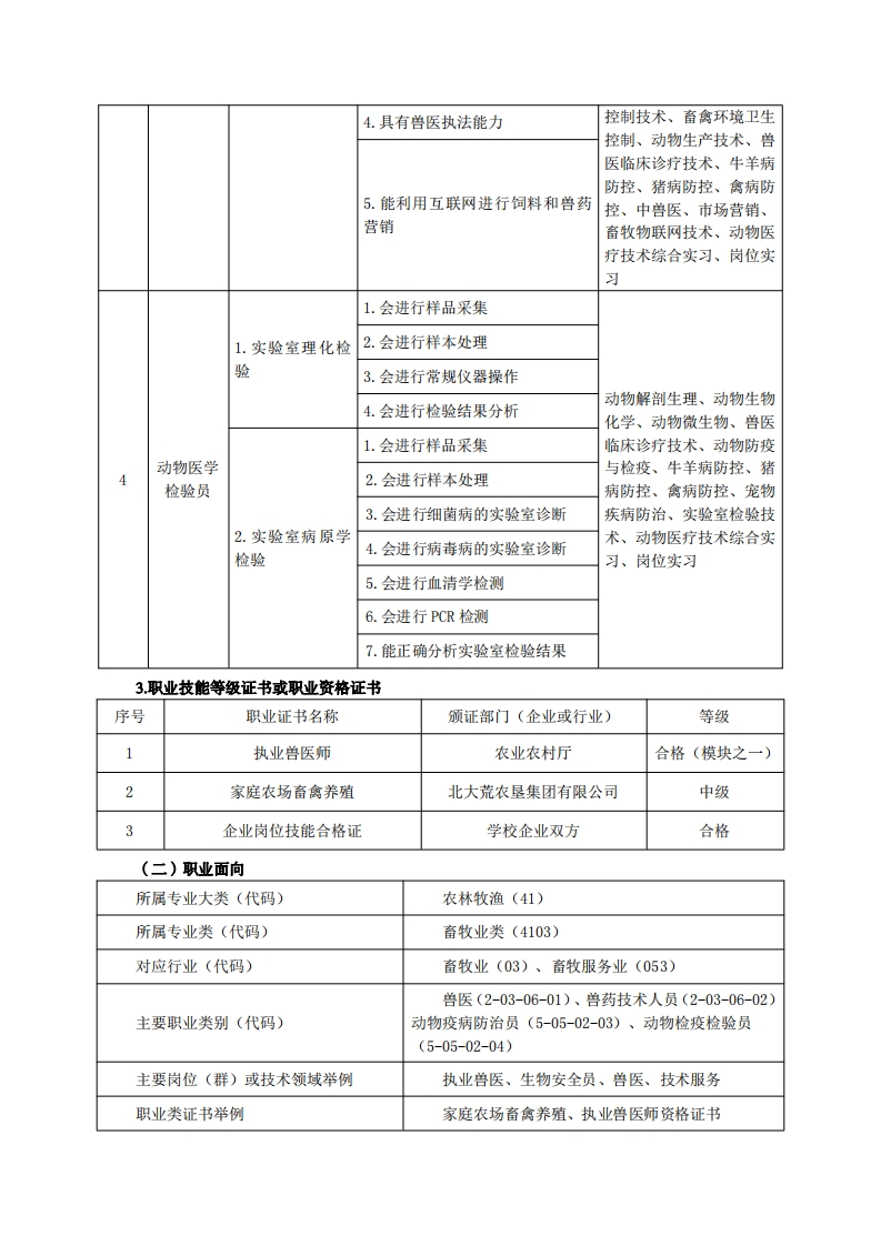 《动物医学》专业人才培养方案一、专业名称及代码专业名称:动物医学专业代码:410301二、入学要求招生对象:高中(中职)毕业生或具有同等学力者。招生类型:理科。三、修业年限三年。四、职业面向(一)职业能力分析1专业服务面向毕业生主要面向动物养殖企事业单位及与之相关的动物养殖、疾病防治、检疫等部门,在畜牧行业或兽医行业从事动物生产、兽药经营、疾病防治、卫生检验、兽药营销、兽医行政执法等服务、技术指导或管理工作。适应岗位群是:①规模养殖场畜禽生产、疾病防控和监测。②兽药、饲料等企业的生产、销售及技术服务。③屠宰管理站、动物疫控中心等兽医行政管理部门的技术性工作。④动物诊疗机构的疾病诊治。⑤兽医相关的诊断、检验和化验。2.职业岗位与职业能力分析序号工作岗位典型工作任务职业能力支撑课程1.能正确保存和准备生物制品动物解剖生理、动物微生物、动物流行病学基础、2.会制定动物免疫程序兽医临床诊疗技术、畜牧3.能正确使用疫苗等生物制品兽医法规、智能养殖环境控制技术、动物生产技术、1.动物疾病防控4.会正确消毒器械、场地等畜禽环境卫生控制、动物5.动物疫病监测营养与饲料、实验室检验养殖企业技术、动物防疫检疫技术、兽医6.具有兽医执法能力猪病防控、禽病防控、牛7.能合理安排和判断动物养殖生羊病防控、动物医疗技术产环节综合实习、岗位实习1.会进行动物疾病临床检查动物解剖生理、动物病理、动物流行病学基础、兽医2.动物疾病诊断2.会进行动物疾病实验室诊断临床诊疗技术、实验室检3.会进行动物疾病病理学诊断测技术、畜禽繁育、猪病