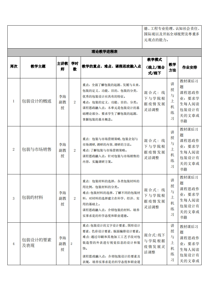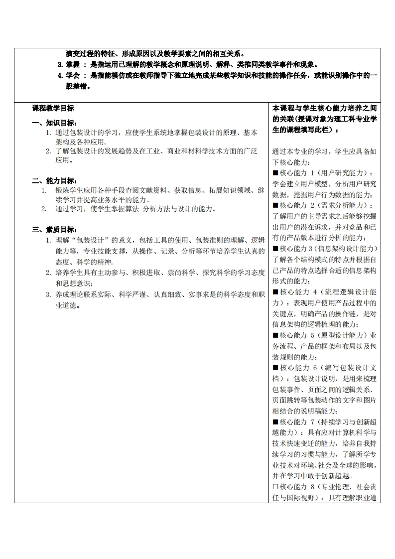《包装设计》教学大纲课程类别(必修/选修):选课程名称:包装设计修课程英文名称:总学时/周学时/学分:32/2/2其中实验/实践学时:16/0先修课程:授课时间:4-19周星期一56节授课地点:实114机房授课对象:2021多媒体(粤台)开课学院:粤台产业科技学院任课数师姓名/职称:李海/副教授答疑时间、地点与方式:1.每次课的课前、课间和课后,采用一对一的问答方式:2.每次习题课,采用集中讲解方式课程考核方式:开卷()闭卷()课程论文()其它()使用教材:《包装设计》陈磊编著中国青年出版社散学参考资料:1、《包装设计基础》魏洁编著上海人民美术出版社2、《包装设计教学》刘小玄编著江西美术出版社3、《包装设计》杨仁敏编著西南师范大学出版社课程概述《包装设计》是电脑美术设计、装潢艺术设计专业必修专业设计课程,是结合了各种专业设计课程内容,同时综合性很强的艺术设计学科。它既有视觉传达语言中的造型结构、图形、色彩、文字、编排等内容,又涉及到材料、印刷、工艺等技术环节还要结合消费心理学、市场营销学、技术美学等内容学科。该课程旨在使学生具备有效传达信息的艺术手段,使他们掌握如何按照美的形式、规律和法则,来提高审美意识和表现能力,从而开拓思路,增强创新意识,提高创新能力。这对最终实现产品销售起着至关重要的作用。教学目标通过该课程的学习,培养学生对包装流程中的市场调研,包装材料,包装技术,印刷流程,以及运输、销售和计算机制作过程有系统了解。学生能从艺术设计的角度出发,根据商品的特点,销售方式,结合市场学、消费心理学,以及包装材料和生产方式,独立进行包装结构和容器造型、包装装潢的统一设计,并掌握系列化、礼品化商品的包装设计创意方法和表现技法。为其将来参加设计工作打下良好的基础。教学中应注意对学生高级技能培养,注重应用型人才的塑造。本课程前续课程:平面构成、色彩构成、立体构成、图案、商标设计、字体与版式设计、装饰基础、摄影、书法等。本课程后续课程:CIS、毕业实习、毕业设计这门学科的知识与技能要求分为知道、理解、掌握、学会四个层次。这四个层次的一般通义表述如下:1.知道:是指对这门学科和救学现象的认知。2.理解:是指对这门学科涉及到的概念、原理、策略与技术的说明和解释,能提示所涉及到的教学现象