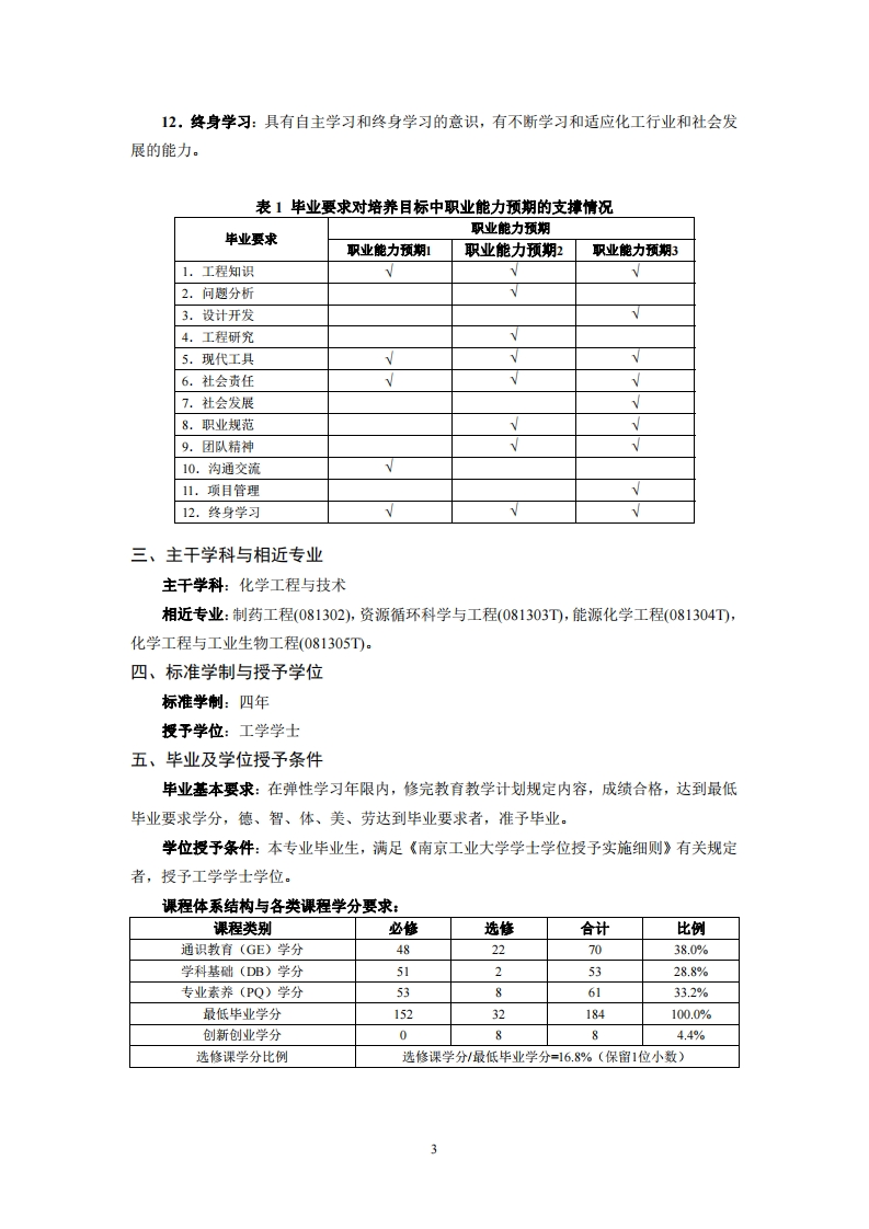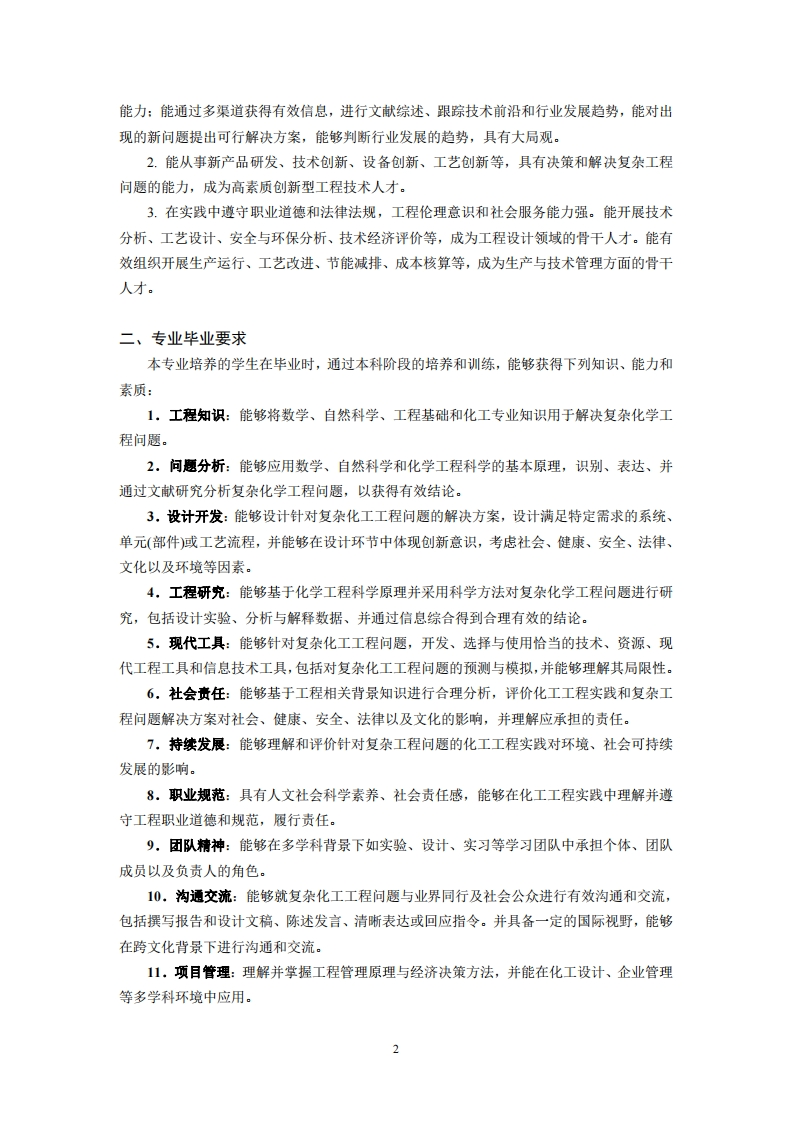 化学工程与工艺专业2022级培养方案学科门类工学专业类化工与制药类制订人张晓艳审核人周浩力O、专业类及专业简介化工类专业是一个宽口径、适应性强的通用型过程工程专业,是与高新科技最密切相关的工科专业之一。化学工程与技术是研究以化学工业为代表的各类工业生产中有关化学过程与物理过程的一般原理和规律,并应用这些原理和规律来解决过程及装置的开发、设计、操作及优化问题的工程技术学科。包括化学工程、化学工艺、生物化工、应用化学和工业催化。学科内容体现基础与应用并重的特点,包括基础理论、基本方法和基本实验技术,以及工艺开发、过程设计、系统模拟与优化和操作控制、产品研发等,是实现化工产业绿色化、智能化升级的技术基础、力量核心和发展的原动力。化学工程与工艺专业是南京工业大学的主干专业之一,具有近百年的办学历史,源于1921年金陵大学工业化学系和1927年第四中山大学化工科,创始人时钧院士是我国化工学科倡导者之一,培养了包括19名两院院士为代表的大批杰出科学、工程与管理人才。本专业依托的化学工程与技术学科,2007年被评为首批国家一级重点学科,教育部第四轮学科评估位列A档。拥有化学工程与技术一级学科博士点、国家一流本科专业建设点、化学工程与工艺国家级特色专业、国家级实验教学示范中心、国家虚拟仿真实验教学项目、国家一流课程,国家课程思政示范课程,化工原理和化工热力学国家精品课程,材料化学工程国家重点实验室、特种分离膜国家工程技术研究中心。本专业形成了基于“课程链人才链产业链”三链对接的特色化工人才培养体系。本科生培养规模位居全国前列。拥有1个国家级优秀教学团队,1个全国高校黄大年式教师团队,1个国家实验教学示范中心,2个国家级工程实践教育中心,1个国家级大学生实践教学基地,获得国家教学成果一、二等奖3项,江苏省教学成果特等奖2项。一、专业培养目标本专业培养德、智、体、美、劳全面发展,具备良好社会责任感,创新精神和扎实实践能力的高级工程科学、技术和管理人才,能够在化工、医药、材料、能源、环保和安全等行业,从事研究开发、工程设计与管理、生产与技术管理和安全环保等工作,成为中国特色社会主义事业的合格建设者和可靠接班人。本专业毕业学生经过5年左右的实践锻炼,应具备以下主要职业能力:1.能够采用多媒体等多种方式,表达工作方法、建议和结论,具有较好的学习与表达