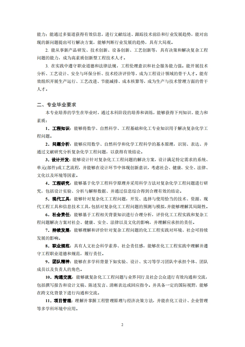 化学工程与工艺专业2023级培养方案学科门类工学专业类化工与制药类制订人张晓艳审核人周浩力0、专业类及专业简介化工类专业是一个宽口径、适应性强的通用型过程工程专业,是与高新科技最密切相关的工科专业之一。化学工程与技术是研究以化学工业为代表的各类工业生产中有关化学过程与物理过程的一般原理和规律,并应用这些原理和规律来解决过程及装置的开发、设计、操作及优化问题的工程技术学科。包括化学工程、化学工艺、生物化工、应用化学和工业催化。学科内容体现基础与应用并重的特点,包括基础理论、基本方法和基本实验技术,以及工艺开发、过程设计、系统模拟与优化和操作控制、产品研发等,是实现化工产业绿色化、智能化升级的技术基础、力量核心和发展的原动力。化学工程与工艺专业是南京工业大学的主干专业之一,具有近百年的办学历史,源于1921年金陵大学工业化学系和1927年第四中山大学化工科,创始人时钧院士是我国化工学科倡导者之一,培养了包括19名两院院士为代表的大批杰出科学、工程与管理人才。本专业依托的化学工程与技术学科,2007年被评为首批国家一级重点学科,教育部第四轮学科评估位列A档。拥有化学工程与技术一级学科博士点、国家一流本科专业建设点、化学工程与工艺国家级特色专业、国家级实验教学示范中心、国家虚拟仿真实验教学项目、国家一流课程,国家课程思政示范课程,化工原理和化工热力学国家精品课程,材料化学工程国家重点实验室、特种分离膜国家工程技术研究中心。本专业形成了基于“课程链人才链产业链”三链对接的特色化工人才培养体系。本科生培养规模位居全国前列。拥有1个国家级优秀教学团队,1个全国高校黄大年式教师团队,1个国家实验教学示范中心,2个国家级工程实践教育中心,1个国家级大学生实践教学基地,获得国家教学成果一、二等奖3项,江苏省教学成果特等奖2项。一、专业培养目标本专业培养德、智、体、美、劳全面发展,具备良好社会责任感,创新精神和扎实实践能力的高级工程科学、技术和管理人才,能够在化工、医药、材料、能源、环保和安全等行业,从事研究开发、工程设计与管理、生产与技术管理和安全环保等工作,成为中国特色社会主义事业的合格建设者和可靠接班人。本专业毕业学生经过5年左右的实践锻炼,应具备以下主要职业能力:1.能够采用多媒体等多种方式,表达工作方法、建议和结论,具有较好的学习与表达