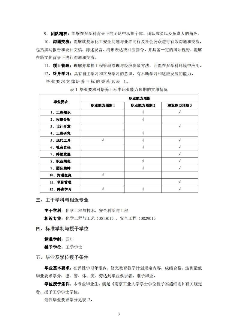 化工安全工程专业2022级培养方案学科门类工学专业类化工与制药类制订人朱育丹审核人朱家华0、专业类及专业简介化工类专业是一个厚基础、宽口径、适应性强的通用型过程工程专业,是与高新科技最密切相关的工科专业之一。化学工程与技术是研究以化学工业为代表的各类工业生产中有关化学过程与物理过程的一般原理和规律,并应用这些原理和规律来解决过程及装置的开发、设计、操作及优化问题的工程技术学科。包括化学工程、化学工艺、生物化工、应用化学和工业催化。学科内容体现基础与应用并重的特点,包括基础理论、基本方法和基本实验技术,以及工艺开发、过程设计、系统模拟与优化和操作控制、产品研发等,是化学工业的技术基础、力量核心和发展的原动力。当前,化工安全是安全生产的重中之重。以“危害物质的最小化、高危物质的替代化、剧烈反应的温和化、过程工艺的简单化”为目标的本质安全化,是当前我国化工发展的重要发展方向。开展化工本质安全关键技术创新,转变被动式的事故应急管理为主动式的本质安全与预防控制,从根本上提升化工安全水平,本质上都需要化工安全工程专业人才,化工安全工程人才是实现本质安全生产的核心。化工安全工程专业是南京工业大学根据国家战略发展的要求与社会对化工人才的需求变化而设立的。专业以原有国家一流本科专业建设点、国家特色专业一“化学工程与工艺专业”为基础,延续“课程链人才链产业链”三链对接的特色化工人才培养体系,同时吸纳学校国家特色专业一“安全工程专业”的优势资源和力量,旨在以化工“三传一反”基础知识和新技术为引导,安全理论和技术为提升,培养一批化工安全复合型人才,助力国家全面提升化工行业本质安全水平。目前,拥有化学工程与技术一级学科博士点、国家级实验教学示范中心、国家虚拟仿真实验教学项目、国家一流课程,国家课程思政示范课程,化工原理和化工热力学国家精品课程,材料化学工程国家重点实验室、特种分离膜国家工程技术研究中心。1个国家级优秀教学团队,1个全国高校黄大年式教师团队,1个国家实验教学示范中心,2个国家级工程实践教育中心,1个国家级大学生实践教学基地,获得国家教学成果一、二等奖3项,江苏省教学成果特等奖2项。一、专业培养目标本专业培养目标整体描述:本专业旨在培养德、智、体、美、劳全面发展,具有良好的社会责任感、创新精神和扎实实践能力的高级工程科学、技术和管理人才。理解化学工程与