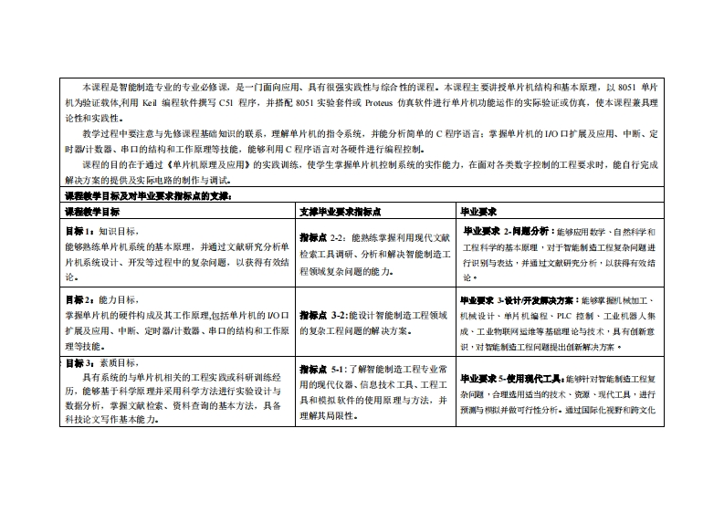 《单片机原理及应用》教学大纲课和名称,单片机原理及应用课和类别(必能选修)·必修课程英文名赫:Principle and Application of Single Chip Microcortroller总学时周学时学分:564/35其中实险实液学时,20先修课是:大学计算机基础、电工与电子技术、程序设计1后续裸度支撑:嵌入式系统授课时间:周三1-3节,第2周一17周授课地点:实验楼216室周五5-6节,第11周一14周授课对津:2021智能制造1班开课学跳:粤台产业科技学院任课微师姓名职稀:庄宏样/教授答展时间、地点与方式:L,周二g0012:00W实验楼214:2每次习题课,采用集中讲解方式。程考楼方式:开港()闭卷()课程论文()其它(√)非试卷类报告使用装村椭才高.(单片机原理及应用)(第2[M,武汉:华中科技大出版社,2021,做学考资料:姜志海、赵艳雷、陈松.《单片机的C语言程序设计与应用》(第3园[,电子工业出版社,2015.林立《单片机原理及应用:C51语言版》M北京:电子工业出版社,2018课程葡介: