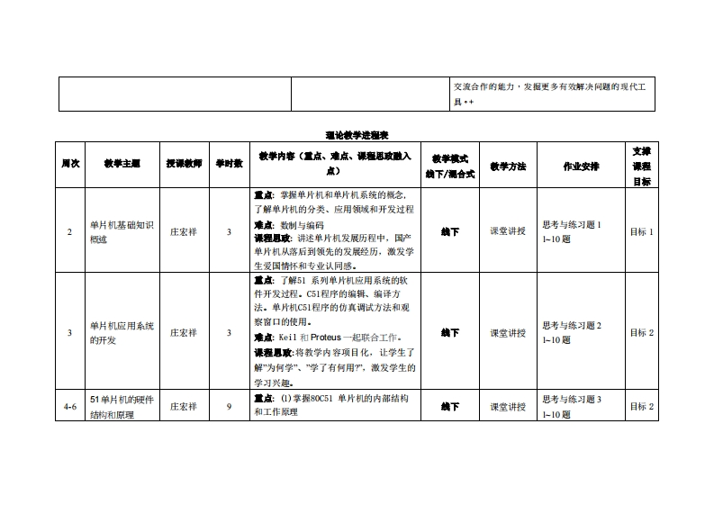 《单片机原理及应用》教学大纲课和名称,单片机原理及应用课和类别(必能选修)·必修课程英文名赫:Principle and Application of Single Chip Microcortroller总学时周学时学分:564/35其中实险实液学时,20先修课是:大学计算机基础、电工与电子技术、程序设计1后续裸度支撑:嵌入式系统授课时间:周一1-3节,第2周一17周授课地点:实验楼216室周五7-8节,第11周一14周量课对津:2021智能制造2班开课学跳:粤台产业科技学院任课微师姓名职稀:庄宏样/教授答展时间、地点与方式:L,周二g0012:00W实验楼214:2每次习题课,采用集中讲解方式。程考楼方式:开港()闭卷()课程论文()其它(√)非试卷类报告使用装村椭才高.(单片机原理及应用)(第2[M,武汉:华中科技大出版社,2021,做学考资料:姜志海、赵艳雷、陈松.《单片机的C语言程序设计与应用》(第3园[,电子工业出版社,2015.林立《单片机原理及应用:C51语言版》M北京:电子工业出版社,2018课程葡介: