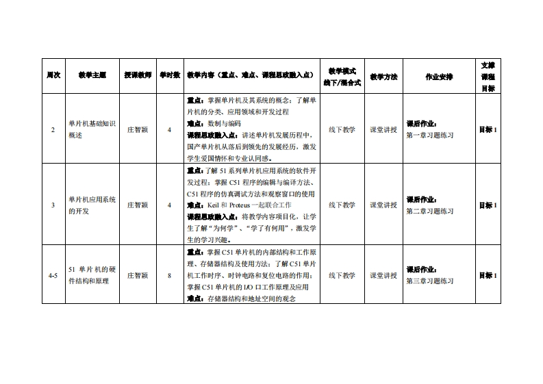 《单片机原理及应用》教学大纲裸应名称:单片机原理及应用课类别(必修选修)事必修课程英文名称:Principle and Application of Single Chip Microcontroller总学时周学时学分,5643.5其中实检实减学时,20先熊课是:大学计算机基础与计算思维、C语言程序设计、电工电子技术后续课程支撑嵌入式系统授课时间:2至15周星期一34节、星期三1-2节授课地点:6412、机电接201提课对津:2023智能制造1,2班开裸学瑰:粤台产业科技学院任课就姓名称:庄智领/副教授容鞭时间、地点与方式:1每次课的课前、课间和课后,采用一对一的问答方式:2每次习题课,采用集中讲解方式。课程考被方试:开卷()闭港()课程论文()其它(√)非试卷类报告使用村,《单片机原理及应用(第二版)》,儒才高,华中科技大学出版社,SBN:9787568073523.微学◆考度料:《单片机原理与应用》,胡凤忠、高金定、廖亦凡,机械工业出版社,SBN:9787111736660。《单片机原理及应用(C51语言版)》,林立,电子工业出版社,ISBN:9787121339004。《单片机的C语言程序设计与应用一基于Pots仿真(第4版)》,姜志海、姜沛助,电子工业出版社,ISBN:97871213256。课程物介:本课程是智能制造专业的专业必修课,是一门面向应用、具有很强实践性与综合性的课程。本课程主要讲授单片机结构和基本原理,以即51单片机为验证载体,利用K1编程软件撰写C51程序,并搭配O51实验套件或Proteus仿真软件进行单片机功能运作的实阿验证或仿真,使本课程兼具理论性和实践性。教学过程中要注意与先修课程基础知识的联系,理解单片机的指令系统,并能分析简单的C程序语言:掌握单片机的ID口扩展及应用、中