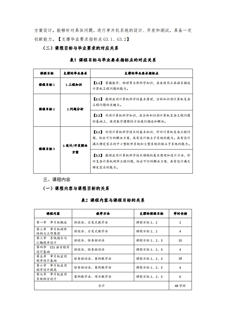 《单片机原理及应用》课程教学大纲一、课程信息课程名称:单片机原理及应用Foundation and Application of Microcontroller课程代码:06E4123B课程类别:专业核心课适用专业:计算机科学与技术课程学时:48学时(含16学时实验)课程学分:2.5学分修读学期:第五学期先修课程:电路与电子技术、数字电子技术、程序设计基础二、课程目标《单片机原理及应用》是计算机科学与技术专业的专业核心课程,是一门理论性、应用性很强的课程。通过本课程的教学,使学生掌握单片机工作原理、单片机接口技术及应用系统的设计方法,培养和锻炼学生运用单片机技术对硬件、软件进行开发设计的能力,使学生具有分析和解决工程领域中与单片机控制系统相关的工程问题的能力,为从事与本专业相关的工程技术工作奠定良好的基础。单片机原理及应用主要包括单片机硬件、软件技术方面的基础知识和应用系统的开发。(一)具体目标通过本课程的学习,使学生达到以下目标:1.掌握单片机的结构和工作原理,理解定时/计数器、串行接口、中断系统的结构,掌握单片机汇编语言、C语言程序设计基本方法,掌握单片机应用系统的一般设计步骤,具备使用工具语言描述工程问题的能力。【支撑毕业要求指标点G1.1】2.能够应用单片机基本原理和知识,识别相关工程领域问题的关镀点,进行系统分析,解决单片机系统中出现的问题。【支撑毕业要求指标点G2.1、G2.2】3.能够根据设计要求,应用单片机技术知识提出合理的解决方案,并进行