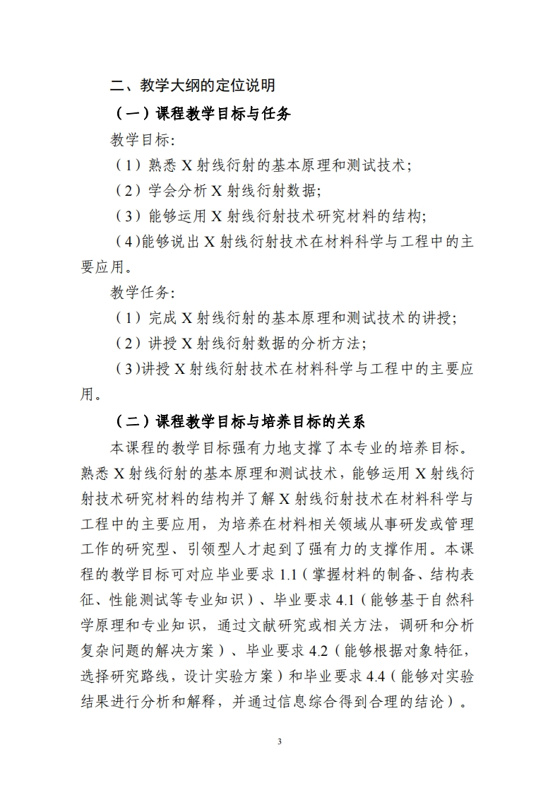 《X射线衍射》课程教学大纲一、课程概况课程名称X射线衍射课程号1412066课程英文名称X-ray diffraction学时/学分36/2课程性质必修适用专业材料物理、材料化学、功能材料、新能源材料与器件课程负责人寇昕莉教学团队徐远丽,刘书海《X射线衍射理论与实践》,黄继武,李周,化学工业出版社选用散材及《晶体X射线衍射学基础》,李树棠,冶金工业出版社参考书目《金属X射线学》,范雄,机械工业出版社《X射线衍射技术及其应用》,姜传海等,华东理工大学出版社课程简介:本课程主要针对材料物理、材料化学、功能材料和新能源材料与器件专业的本科生开设。通过学习X射线衍射的原理、测试技术以及它们在材料科学与工程中的应用来掌握如何用X射线衍射的方法来分析材料的结构。使学生能够掌握X射线衍射的基础知识和基本技能,能够正确地运用X射线衍射技术开展有关的科学研究,为今后从事材料科学的研究工作打下必要的基础。X课程目标(Course Objectives,,CO)熟悉X射线衍射的基础理论知识知识目标(CO1)学会X射线衍射数据的基本处理方法能力目标(C02)学会用X射线衍射的方法分析材料的结构素质、情感价值观目标(CO3)■PM1讲授法教学学时70%■PM2研讨式学习学时10%敢教学方式(Pedagogical■PM3案例教学学时20%口PM4翻转课堂学时%Methods,PM)口PM5混合式教学学时%口PM6体验式学91学时%考核方式(Evaluation试■EM1课程作业35%■EM2单元测试15%oEMB课堂辩论%Methods.EM)课