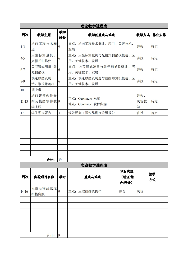 《反向工程技术》课程教学大纲课程名称:反向工程技术课程类别(必修/选修):选修课程英文名称:Reverse Engineering Technology总学时/周学时/学分:48/3/3其中实验/实践学时:9先修课程:无授课时间:1至16周,周二9-11节授课地点:1-10周实216,11-16周401机房授课对象:2018精密制造1班开课学院:粤台产业科技学院任课教师姓名职称:吕杰融副教授答乘时间、地点与方式:课前、课间和课后;数室;网络、交流课程考核方式:开卷()闭卷()课程论文()其它()使用教材:《逆向工程技术》,成思源,杨雪荣,机械工业出版社,2017。教学参考资料:《逆向工程与快速成型技术应用(第2版)》,陈雪芳,孙春华机械工业出版社,2015。课程简介:本课程是机械设计制造及其自动化(精密制造)专业任选课,综合和归纳了逆向工程中的关键技术及常用和新兴的软、硬件系统。本课程目在让学生了解掌握数据采集技术、数据处理与CAD建棋技术等,并对各软、硬件系统的基本原理、系统构成和操作流程进行介绍,并通过课程实践为学生提供第一手实操机会,加深学生对逆向工程技术的理解。课程敢学目标本课程与学生核心能力培养之间的关联授课对象为理工科专业学本课程是机械设计制造及其自动化精密制造)专业的任选课,生的课程填写此栏):本课程的散学目标是:口核心能力1.应用数学、基础科1.理解逆向工程的概念学和机械设计制造及其自动化专业知识能力:2.运用逆向工程仪器、软件进行数字模型构建口核心能力2.设计与执行机械设3.掌握实现逆向工程的具体环节计制造及其自动化专业相关实验,4.通过现场案例教学掌星逆向工程实践的整体流程以及分析与解释相关数据的能力:☑核心能力3.机械工程领域所需技能、技术以及实用软硬件工具的能力:口核心能力4.机械工程系统、零部件或工艺流程的设计能力:☑核心能力5.项目管理、有效沟通协调、团队合作及创新能力:☑核心能力6.发掘、分析与解决复杂机械工程问题的能力:☑核心能力7.认识科技发展现状与趋势,了解工程技术对环境、杜会及全球的影响,并培养持续学习的习惯与能力:口核心能力8.理解职业道德、专业伦理与认知社会责任的能力。