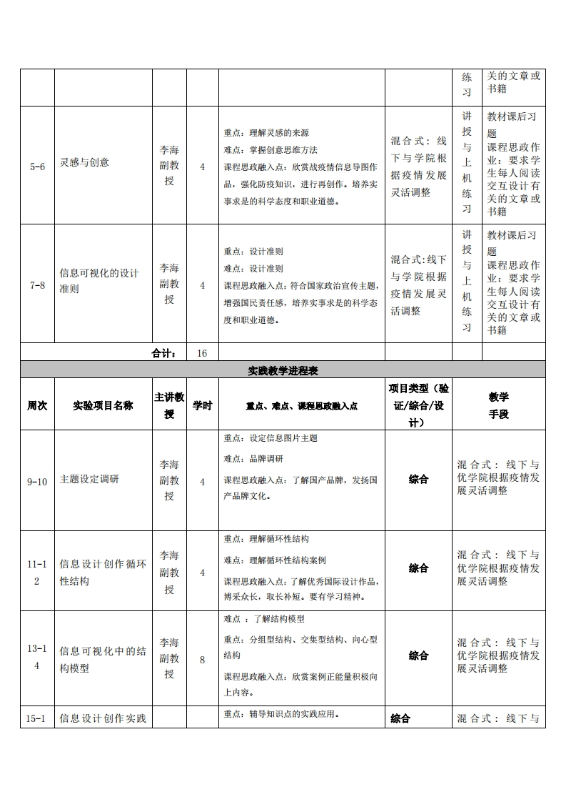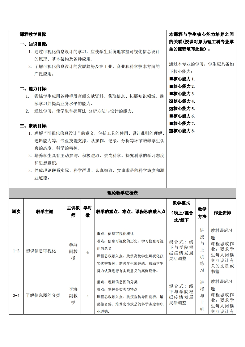 《可视化信息设计》教学大纲课程类别(必修/选修):选课程名称:可视化信息设计徐课程英文名称:Visul information Design总学时/周学时/学分:32/2/2其中实验/实践学时:16/0先修课程:授课时间:授课地点:授课对象:2020计技设计1班(粤台)开课学院:粤台产业科技学院任课教师姓名/职称:李海/副教授答疑时间、地点与方式:1.每次课的课前、课间和课后,采用一对一的问答方式:2.每次习题课,采用集中讲解方式课程考核方式:开卷()闭卷()课程论文()其它()使用教材:《信息设计》崔华春中国建筑工业出版社2016教学参考资料:[1]乔尔卡茨主编,《信息设计之美》,人民邮电出版社,2019[2]李金涛主编,《信息可视化设计》,人民邮电出版社,2016课程概述本课程的目的讲解了各种与信息可视化相关的设计知识与技巧。主要围绕信息可视化的基础概论、结构模型、图表模型、四大要素展开。经典案例进行了分析,使读者能够将前面所学知识加以巩固,达到学以致用的目的。敢学目标1、使学生从宏观上充分了解概历史及意义。2、掌握信息图标的分类。3、理解设计准则及设计流程,能根据理论知识进行创作实践。这门学科的知识与技能要求分为知道、理解、掌握、学会四个层次。这四个层次的一般通义表述如下:1.知道:是指对这门学科和散学现象的认知。2.理解:是指对这门学科涉及到的概念、原理、策略与技术的说明和解释,能提示所涉及到的教学现象演变过程的特征、形成原因以及教学要素之间的相互关系。3.掌握:是指运用已理解的散学概念和原理说明、解释、类推同类敢学事件和现象。4.学会:是指能模仿或在教师指导下独立地完成某些教学知识和技能的操作任务,或能识别操作中的一般差错。