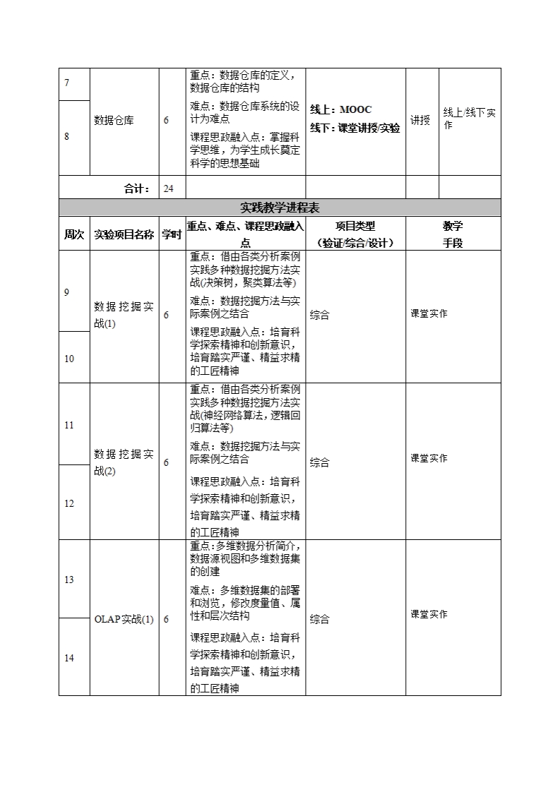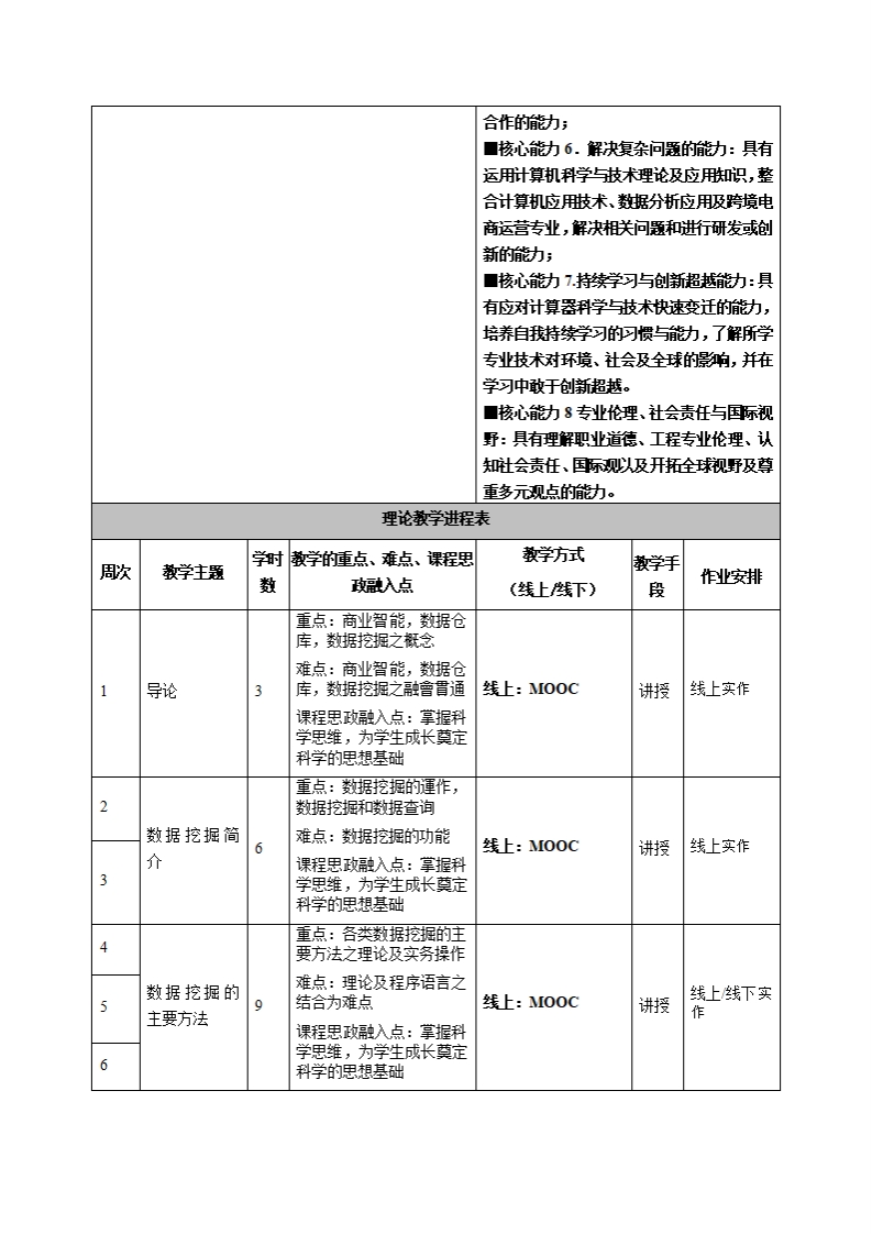 《商业智慧处理分析》教学大纲课程名称:商业智慧处理分析课程类别(必修选修):选修课程英文名称:Busi血ess intelligence analysis总学时/调学时学分:48/33其中实验实践学时:24先侈课程:授课时问:星期三(一~三节授课地点:6405授课对像:18级计算机科学与技术系(电商专业开课学院:皂台产业科技学院/计算机科学与被术系任课教师姓名职称:扬硕蓉/副授答疑时间、地点与方式:课程考核方式:开卷()闭卷()课程论文()其它(O)使用散材:用商业案学R语言数据挖据经管之家电子工业出版社教学多考资料:《数据挖据教程》翁敬农等译清华大学出版社《数据挖据疑念与技术》Jiawei Han机械工业出版社《数据仓库与数据挖据应用嫩程》李春葆等清华大学出版社《SQL Server数据挖据与商业智能基础极案例实战》谢邦昌中国水利水电出版课程简介:商业智能被理解为将企业中现有的数据转北为知识,帮助企业做出明智的业务经营决策的工具。为了将数据转化为知识,需要利用数据仓库、联机分折处理工具和据挖据等技术。本课程将从这三方面技术展开讲解。课程教学日标本课程与学姓核心能力培养之间的联联授一、知识目标:课对像为理工科专业学生的课程填写此拦):1.将企业中现有的数据转北为知识,帮助企业做出■核心能幼1.交叉知识的运用能动:具有运明智的业务经营决策的工具;数学、基础科学级计算机科学与被术相关2.引导学生对数据挖据产生兴趣,并日逐培养学知识的能动;生的据意识,并为以后深入学习相联理论及应用下■核心能动2.实验与数据解读能力:具有计的基础。算机软件开发与数据搜寻分折解释的能力;二、能动目标:■核心能动3技术工具的应用能动:具有计1.熟练掌握较为成熟的技术和防法具有相应的应算器款件工程技术应用、数据搜集纷折应用用盼析能动;跨境电商运营知识与技能、及大数据技术的2.通过该课程的学习,使学生对数据仓库、数据挖专业所需的技术、技能和使用软硬件辅助工据、多维分析的湘联基础知识有一定的了解。具的能动;三、素质目标:口核心能动4计科与大数据分析专业能动:1.培养学生具有主动修与、积极进取、崇尚科学、具有编程设计能力并能应用计算器与数据探究科学的学习态度和思想意识;分析科技来辅助、及大数据技术分析,促进2.养成理论联系实际、科学严谨、认直细政、实事跨境电商运营的能力;求是的学态度和吧业道德。■核心能力5.项目管理与团队合作能力:具有项目管理、有效沟通、领域整合与团队