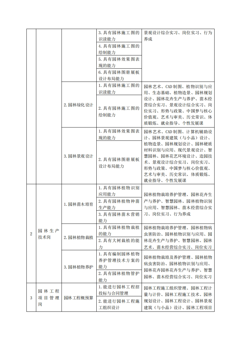 《园林技术》专业人才培养方案一、专业名称及代码专业名称:园林技术专业代码:410202二、入学要求招生对象:高中(中职)毕业生或具有同等学力者。招生类型:文理兼收。三、修业年限三年。四、职业面向(一)职业能力分析1.专业服务面向本专业学生的职业面向规划设计院、园林公司、城建单位等园林相关的单位。就业单位就业部门就业岗位规划设计院设计部制图员、设计师助理、设计师设计部制图员、设计师助理、设计师园林公司项目部资料员、施工员、预算员绿化部绿化设计员城建单位市政工程资料员、施工员、预算员设计部制图员、设计师助理、设计员房地产公司项目部资料员、施工员、预算员生产部苗木生产园林苗圃销售部苗木销售、养护材料销售工程部苗木栽培、绿化养护职业岗位与职业能力分析序工作岗位典型工作任务职业能力支撑课1.具有园林设计图识CAD制图、园林规划设计、园林工程园林1.园林设计图、读能力设计、庭院景观设计、乡村绿地设计、设计师助施工图、效果图理岗的绘制2.具有园林设计图绘计算机辅助设计、园林景观建筑(与制能力小品)设计、园林艺术、造园技术、