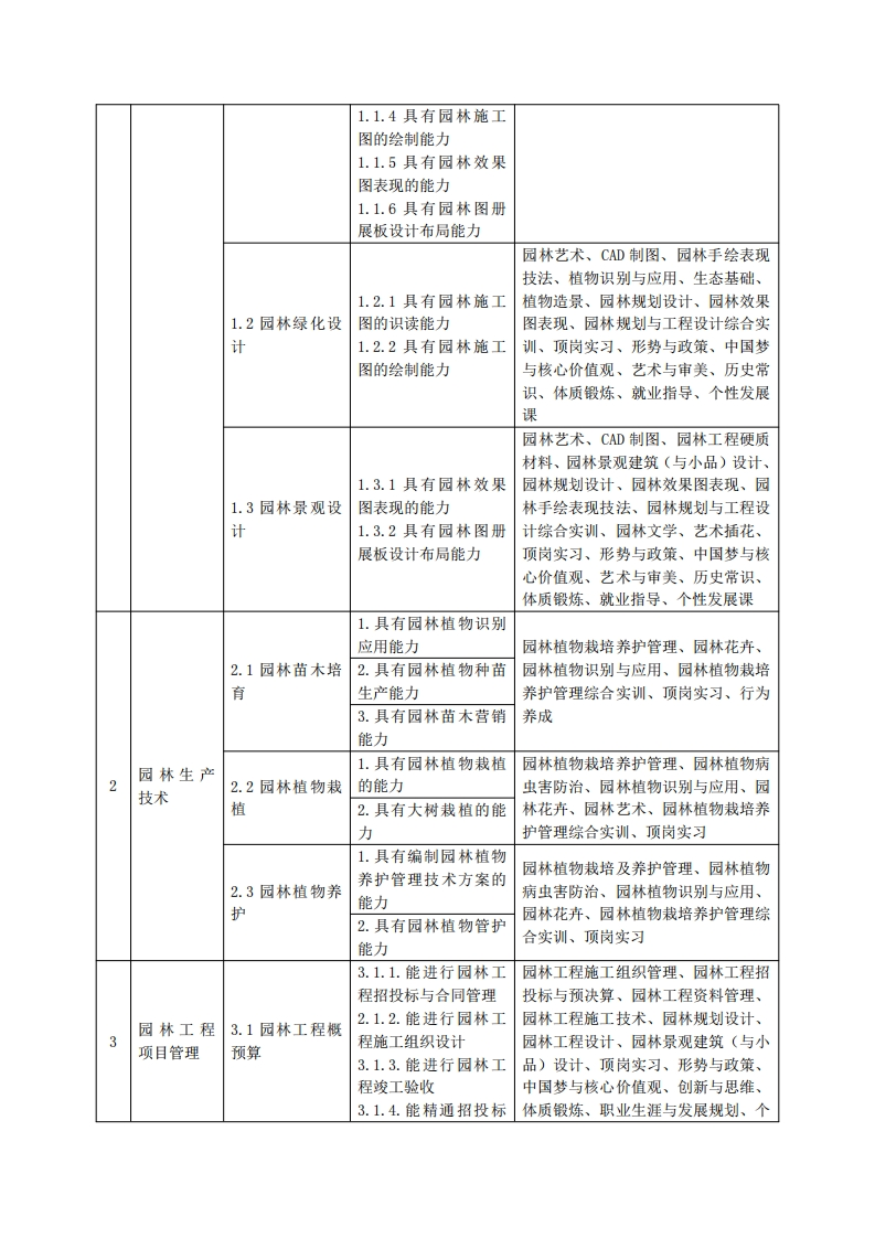 《园林技术》专业人才培养方案一、专业名称及代码专业名称:园林技术专业代码:410202二、入学要求招生对象:高中(中职)毕业生或具有同等学力者。招生类型:文理兼收。三、修业年限三年。四、职业面向(一)职业能力分析1.专业服务面向本专业学生的职业面向规划设计院、园林公司、城建单位等园林相关的单位。就业单位就业部门就业岗位规划设计院设计部制图员、设计师助理、设计师设计部制图员、设计师助理、设计师园林公司项目部资料员、施工员、预算员绿化部绿化设计员城建单位市政工程资料员、施工员、预算员设计部制图员、设计师助理、设计员房地产公司项目部资料员、施工员、预算员生产部苗木生产园林苗圃销售部苗木销售、养护材料销售工程部苗木栽培、绿化养护2.职业岗位与职业能力分析序号工作岗位典型工作任务职业能力支撑课1.1.1具有园林设计图识读能力CAD制图、园林手绘表现技法、建筑园林1.1园林设计图、场地园林景观设计深度及图样、园林设计师助施工图、效果图1.1.2具有园林设计工程设计、园林效果图表现、美学基理的绘制图绘制能力1.1.3具有园林施工础、园林艺术、园林制图与设计表现综合实训、顶岗实习、行为养成图的识读能力