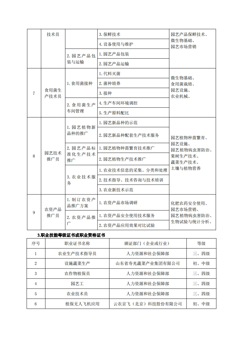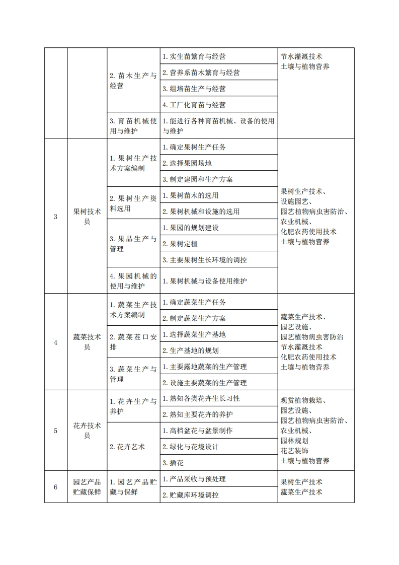 《园艺技术》专业人才培养方案一、专业名称及代码专业名称:园艺技术专业代码:410105二、入学要求招生对象:高中(中职)毕业生或具有同等学力者。招生类型:文理兼收。三、修业年限三年。四、职业面向(一)职业能力分析1.专业服务面向就业领域:园艺生产技术领域、园艺生产管理领域、园艺产品营销领域、农资营销领域。初始岗位:园艺产品生产,种苗繁育,田间生产试验,园艺产品储运,园艺产品及农资产品营销,农村、社区管理等岗位。发展岗位:初始岗位工作3年左右,可以进人种植园规划设计、农业生产项目组织实施、农业企业综合管理等岗位,也可根据专业特长自主创业。2.职业岗位与职业能力分析序号工作岗位典型工作任务职业能力支撑课程1.园艺植物种子生产1.种子生产管2.各级种子的繁育果树生产技术、理蔬菜生产技术、2.新品种推广3.种子管理观赏植物栽培、种子生产生物试验与统计、1技术员4.熟知品种特征特性园艺设施、1.清楚新品种配套栽培技术土壤与植物营养2.种子生产管园艺植物育种技术、2.组培苗生产与经营理园艺植物种苗繁育3.工厂化育苗与经营1.苗圃规划与1.选择苗圃场地园艺植物种苗繁育、苗木繁育建设园艺设施、22.苗圃规划技术员农业机械、3.建园化肥农药安全使用