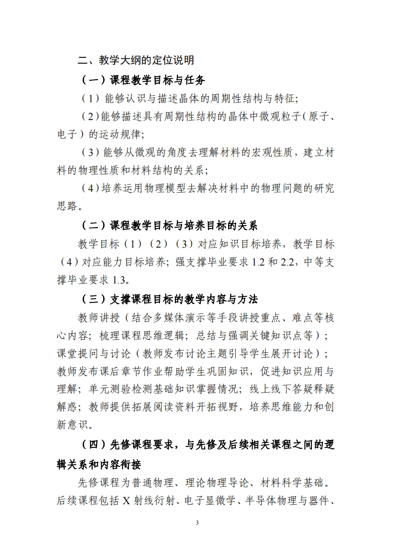 《固体物理导论》课程教学大纲一、课程概况课程名称固体物理学导论课程号1412064课程英文名称Introduction to Solid State Physics学时/学分72/4课程性质必修适用专业材料物理、功能材料、新能源材料与器件课程负责人黄娟娟教学团队倪侠、徐奇选用散材及教材:《固体物理导论》CHARLES KITTEL著项金钟吴兴惠译参考书目参考书目:《固体物理学》胡安、章维益:《固体物理学》黄昆、韩汝琪课程简介:固体物理导论是材料科学相关专业的专业核心课程,是学习材料科学理论的基础。它着重阐述固体的结构、组成粒子间的相互作用以及粒子的运动规律,并在此基础上阐明固体的基本性质及其应用的原理。本课程主要介绍固体物理的一些基础概念,如晶体的周期结构、晶格振动,自由电子气和能带等:着重培养学生对基本物理概念、物理模型和物理过程的理解,使学生了解固体物理的一些基本处理方法并能应用所学的知识解释材料的物理性质和材料结构的关系,构建完整的专业基础知识。课程目标(Course Objectives,CO)熟悉固体物理的基本知识知识目标(C01)理解固体物理的研究方法学会运用物理模型分析问题能力目标(C02)素质、情感价值观目标(C03)☑PM1讲授法教学68学时94%口M2研讨式学习学时%口PM3案例教学学时%口PM4翻转课堂学时%教学方式(PedagogicalMethods.PM)口PM5混合式教学学时%口M6体验式学习学时%回PM7讨论教学4学时6%