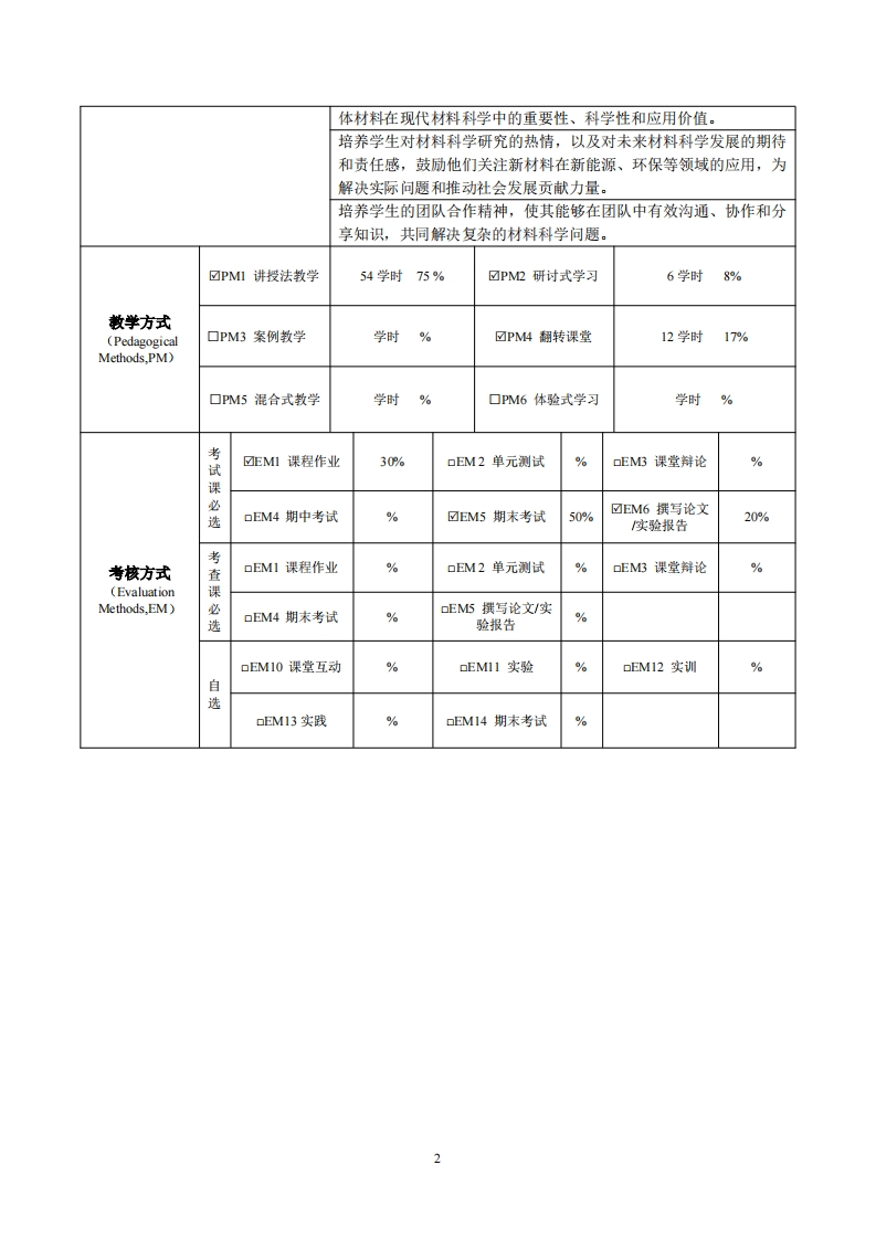 《固体化学》课程教学大纲一、课程概况课程名称固体化学课程号1412025课程英文名称Solid-state Chemistry学时/学分72/4课程性质必修适用专业材料化学课程负责人刘斌教学团队王育华救材:《固体化学》,王育华等著,兰州大学出版社,2008年主要参考书:1.Solid State Chemistry and its Applications,Second Edition:Student Edition Anthony选用教材及R.West Wiley,Release Date 3/10/2014参考书目2.《固体化学及其应用》[美]AnthonyR.West著,苏勉曾,谢高阳,申泮文等译,上海:复旦大学出版社,1989年3.《固体化学导论》,苏勉曾著,北京大学出版社,1987年4.《结晶化学导论》钱逸泰著,中国科技大学出版社,1988年5.《无机材料化学(上册)》曾人杰著,厦门大学出版社,2002年课程简介:固体化学(Solid-state Chemistry)是研究固体物质的制备、组成、结构和性质及应用的,由物理、化学及材料等众多学科互相渗透交叉而产生的新兴学科。主要针对材料化学专业的本科生开设。通过对这门课程的学习,对无机材料的制备、结构确定、性能测试及其应用有一个系统和深入的认识,使学生能够了解固体材料的合成、结构、性质及其应用的基本原理,掌握相应的基础知识和基本技能,为今后从事材料科学领域的研究工作打下必要的理论基础。课程目标(Course Objectives,CO)了解固体化学的基本概念、原理和应用,包括晶体学基础、固体中的化学键及能带理论、固体中的缺陷、固溶体、制备方法、无机固体的鉴定技术、固体材料的光性质、低维固体材料和沸石分子筛及知识目标(C01)其相关结构等方面的知识。理解固体材料的合成方法、表征技术和性能测试方法。掌握各种晶体结构类型、化学键类型及其在固体材料中的表现。了解固体材料在实际应用中的重要作用,如发光材料、激光、环境净化材料等。熟练运用固体物质的制备、组成、结构和性质及应用的知识,解决实际材料科学与工程领域的问题,展示出扎实的理论基础和实践能力。能力目标(C02)灵活运用各种无机固体的鉴定技术,解决固体材料研究过程中遇到的各种问题。能够深入分析和概括固体材料应用与制备过程中的关键问题,根据特定的材料性能要求,合理选择和优化制备方法。素质、情感价值观目标(CO3)激发学生对固体材料结构与性能的兴趣和探索精神,使其认识到固