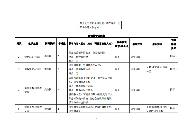 《固定收益证券》教学大纲课名称,圆定收拉正券课忍类别(必修选修)事选修课程英文名称:Fibxed-income Instrument总学时周学时学分,322/2其中实险实液学时,4先继课程:正券投资学、经济学、童敢学、高等兼学后续课度支嫌授课时间:2-17周星期二3-4节授课地点:实217课对津:21经济与金敢2班(金敢管理),22经济与全敢(第二学位)开裸学洗:粤台产业科技学院任课数姓名职淋:龚治国/讲师答展时间、地点与方式:提裸妆室及镜上徽信课狸考楼方式:开卷()闭卷(√)课程论文()其它()使用微村:类承壤同定收益证券(第六版)中国人民大学出版社妆学事考资料:课程简介:本课容属于应用经济举,是经济与金融专业选恤课之一,是投资学和金融举的重要组成部分,在利率市场化的今天,国定收拉证券市场已获得授大发晨,有助于金融市场的发晨与光普。掌四定收益证券工具,有助于投资者的资产配置与优化,课程放学目标及对毕业要求指标点的支排:课意妆学日标支津单业要求指标点单业要求目标1:6专业知识,培养跨专业高素质应用使学生能够初步掌握固定收益证券的基本概念、基本原1能够将数学社会科学、经济基础和金投资专业型经济与金融人才为目标,顺应智能金理,能够运用所学理论知识对固定收益证券进行分析,并知识用于解缺复杂财富管理和基金管理问愿。融的趋势,培养大数据分析能力与人工