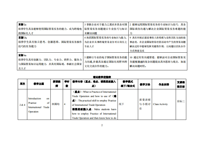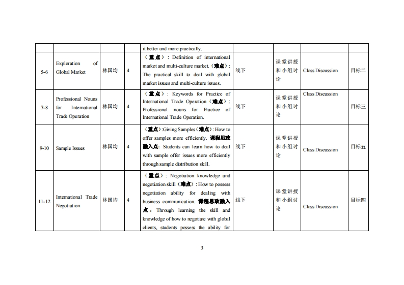 《国际贸易实务》教学大纲课避名称:国际贵毒实务课类别(必修选修)多选修课程英文名称Practice of Intemational Trade Operation总学时周学时学分,322/2其中实检实减学时,0先修塞:无后续课程支推授课时间:2、418周1-2节授课地点:实305提课对津:2021级电商开裸学洗:粤合产业科妆学陕任课枝师姓名淋:林口均测做授笔鞭时间、地点与方式:通过课堂面对面答疑,结合通过微信(QQ》、电子邮件、电话等方式答疑,时间和地点依实际情况灵活处理。是考恢方式:开卷()闭卷()课程论文()其它()报告使用材书名:团际贸易实务作者:王随,石玉川出版社:中国人民大学出版社出版时间:2021年1SBN9787300290461课程简介:国际贸易实务是以国际间商品买卖的理论和国际商务惯例为研究基础,本质上是混合实务知识与应用技术,了解国际贸易实务,最基本关键在于掌握完整的国贸实务流程。国贸实务流程切割为雨大部分,出口程序及进口程序。本课程以出口商的角度思考,教学重点在于市场开发、寻找买方、贸易谈判、样品供给与确认、货物包装、运输方式、处理抱怨与索赔。课程妆学目标及对毕业要求州标麻的支排:课被学目标支撑单业要求指标点毕业要求目标1:1运用国际贸易实务的作业能力与技巧掌挥国际贸易实务操作所需的基础知识、应用能力、创新1具备从事国际贸易实务的语言沟通工作所需的电并能具备将国际贸易实务上发生的问意识和国际化视野子商务英语能力愿沟通解决的能力