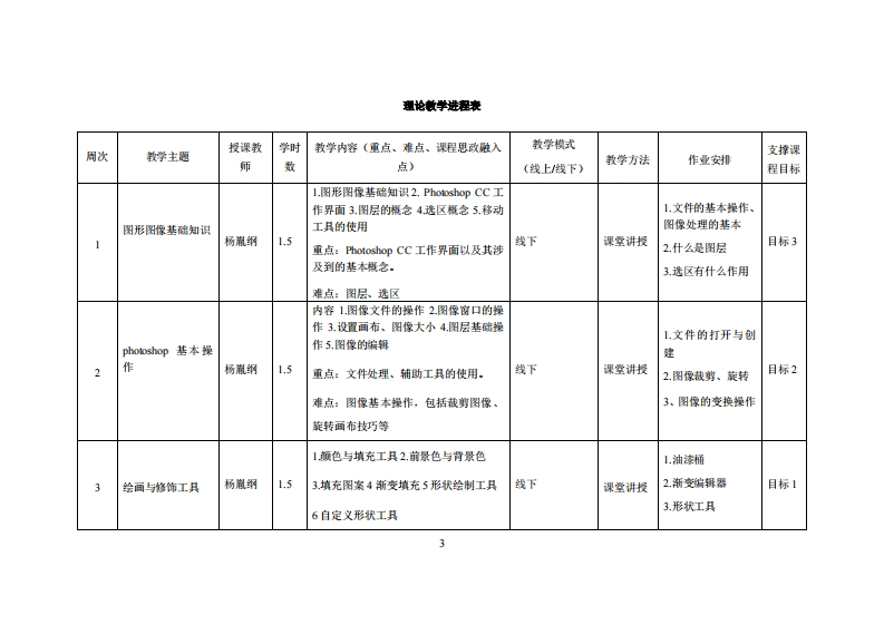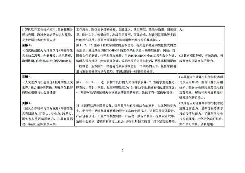 《图像处理入门》教学大纲课程名称:田像处温入门课类别(必修选修)事选修课程英文名称:Photoshop Digital Image Processing总学时周学时学分,4863其中实险实减学时,24先修课庭:本课程无先修委求,可以零基础进行学习!只委保持一颗认真学习的心就可以学好!后续课程支推无授课时间:授课地点:提课对津:2020电商开裸学桃:电商系任课故甲姓名游:杨亂纲/工程师答时间、地点与方式:办公室答疑·QQ·微信课程考恢方式:开卷()闭卷()课程论文()其它()使用藏材:《photoshop图形图像处理应用教程一微课视频版》·梁维娜著·清华大学出版社·2020.11课程简介:本课程是计算机科学与技术·软件工程,物联网工程等专业的选修课·Photoshop是目前最流行的图像处理软件,可以时恤图图像进行编辑加工处理,计算机平面图像处理的基本知识·基本概念和基本操作技能:Photoshop图像处理软件的基本操作与应用·锯助学生了解相关的图像处理知识聊该额城的共它知识,为学生熟练使用计算机进行图形处理和进一步学习共它图形软件时打下基础·课程妆学目标及对毕业要求洲标点的支排计算馨科学与技木专业(時携电商)立足东姚、面向准澳大湾区,产业与行业发晨实际,以社女未来人才需求为向,坚持知行合一、立排满人,着力增养具备计算器款件工程技术与诗境电商运营技术及大数据技术盖础知识、应用能力、创断所意识和国际化视野,培养经济建设、现代产业、社会发晨需要的高素质应用型创渐人才。具体培养目标如下:课程放学目标支排中业要求指标点华业要求目标1+第3-9通过本课程的学习,使学生对Photoshop图像处理技术有一个全面的C1具有运用数学、基础科学及计(专业基础知识与创新能力)培养具有了解,掌握计算机图像处理技术的基本知识、基本理论:掌握图像修饰基础算机科学与技术相关知识的能