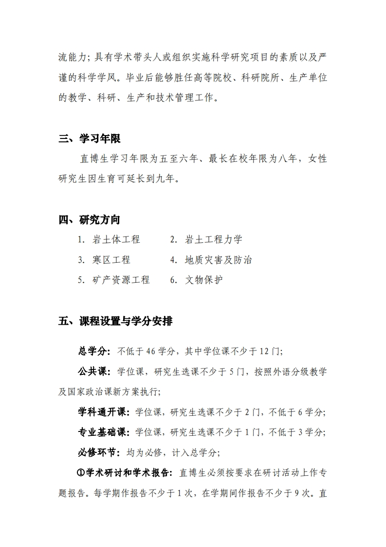 地质工程专业直接攻读博土研究生培养方案代a码:08l803(Geological Engineering.)一、学科概况地质工程是在以原二级学科“探矿工程”和“水文地质与工程地质”为主体的基础上相互交叉渗透发展起来的。本学科与“矿产普查与勘探”和“地球探测与信息技术”同属于一级学科一地质资源与地质工程一的三个相辅相承的二级学科,并与采矿、水利、土木、环境等工程学科相衔接。它以现代钻掘工程技术、现代测试和计算技术为手段,以工程涉及的地质体及工程所在的地质环境为研究对象,服务于矿产资源与开发,土木、水利工程的规划、设计、施工,水文地质、工程地质、环境地质的评价、监测与保护,地质灾害预测与防治和地下深部探测等领域。学科研究范围:工程地质、水文地质与环境地质的评价、监测与测试、物理勘探技术,地质灾害预测的理论与防治技术,工程区域稳定性与大型工程环境效应,岩土物理力学参数测试与应用,工程岩土体稳定性,工程地质数值模拟,矿产资源勘查中的工程地质问题,地质信息技术。地质工程项目的可行性研究、技术经济评价、管理与决策,地质工程勘察、设计、施工和项目管理,不良地质体的加固改造技术。