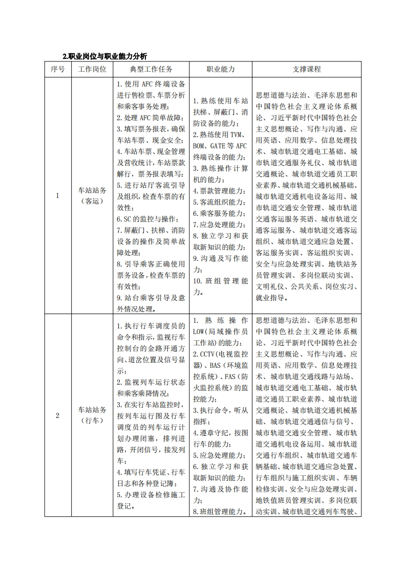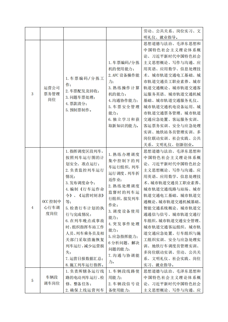 《城市轨道交通运营管理》专业人才培养方案一、专业名称及代码专业名称:城市轨道交通运营管理专业代码:500606二、入学要求招生对象:高中(中职)毕业生或具有同等学力者。招生类型:文理兼收。三、修业年限三年。四、职业面向(一)职业能力分析1.专业服务面向本专业毕业生主要面向城市轨道交通行业企业单位,包括城市轨道交通公司(包括地铁、轻轨城际铁路)从事客运组织与服务、行车调度、票务管理、车站设备运用、接发列车、调车等工作,同时也可从事轨道工程施工、测量、维修养护等相关工作。本专业毕业生就业面向的岗位主要有:地铁、轻轨等城市轨道交通车站站务人员(含值班站长、站长等)、行车调度员:铁路站车运输类岗位(如客运管理、售票管理、车站值班员、列车调度、客运列车长等);轨道交通工程施工类岗位(施工员、测量员、养护维修员等)。随着城市轨道交通规模的不断扩大,尤其是西安城市轨道交通一系列新线路的建成和投入运营,必将会带来轨道交通行车组织、客运组织及服务方面的人才需求,为学院面向轨道交通运输生产一线,培养掌握轨道交通行车组织、客运组织及服务技能人才为主的城市轨道交通运营管理专业提供了良好的发展机遇。城市轨道交通运营管理专业职业面向分析表服务领域城市轨道交通行业、铁路行业等。主要就业去向城市地铁:铁路局车务段、客运段:工程局等部门。城市地铁车站站务、票务管理、行车调度、车辆段调车等:铁路局行车岗位:接发列车、调车工作、列车调度指挥、技术站工作组就业主要岗位织等:铁路局客运岗位:车站旅客服务、客流组织、客票发售等:工程局施工岗位:施工员、测量员、养护维修员等。