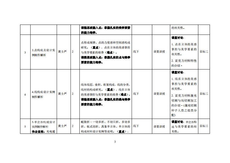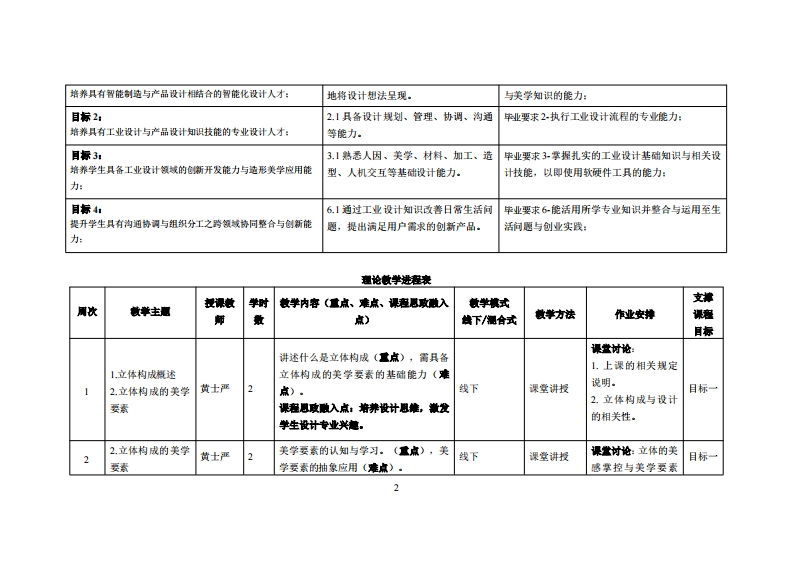 《基本设计》教学大纲课程名称:基本设计课程类别(必修选修):进修课寝英文名蒋:Basic Design总苹时周学时举分:32/22其中实验实度苹时,18先修课程:设计素描、机禁制图与计算机灿助工业设计、金工实习后装课程支津产品设计与型制作、跨城设计授课时间:周一1-21-16周)提课地点:实验楼218发课对◆:2023复工业设计开课学院:事台产业科技学晓任课收师姓名职琳:黄士做战答振时间、地点与方式:圆四12节实202课程考核方式:开卷()闭卷()课程论文()其它(N)使用教材《设计盖差藏之立体构成》,万望着,四南交道大举出顺社,2020年01月1SBN:9787564302153教苹净考资料:《位体构成》,巩尊鼎,幸维,青相东着,中国轻工出顺社,2018年02月1SBN:9787518419296课程情介:通过本课程的学习使学生能等掌产品设计的著本原理及要素,引导学生通过基遭的产品设计体酸、模型材料的性葡和工艺符性用迪形设计的各种美学元素表现手法有意识地去创造产品造型美感,从中墙养学生着随的产品投计的巴维方式和能力。学生通过使好的造形能力与美感培养为本专业的学习打下坚实的盖。课和微学目标及对毕业要求指标减的支排课程就举目标文排华业要求指标点卓业要求目标1:L,1学握工业设计的基础知识,能清晰毕业要求1-熟练运用设计基础知识,智能制造知识