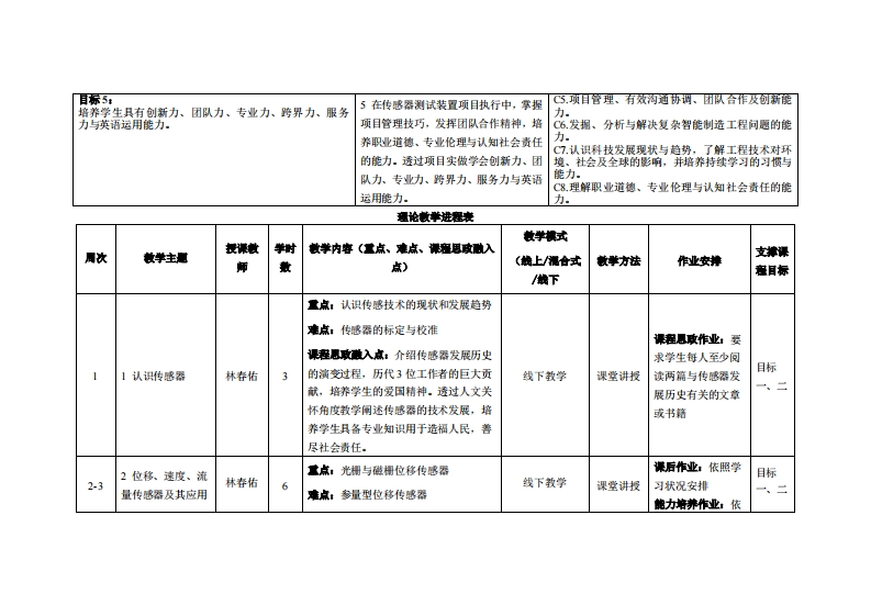 《基础传感器与测试技术》教学大纲课避名称,基础传感器与测试技术课类别(必修选修):选修课课程英文名称:Basic Sensor and Test Technology总学时周学时/学分,48/33其中实验实线学时:9先售课塞:单片机原理与应用后峡课程支雄无授课时间:1-16周授课地点:裸对津:2019级智能制造1班2班开裸学瑰:粤台产业科技学院任课微姓名膏:林春佑/副教授管乘时间、地点与方式:课堂或课后,教室或通讯软件,当面或线上答凝课程考恢方试:开卷()闭卷()课程论文()其它()非试卷类报告使用被村《工业机器人视觉技术及应用》,张明文,人民郎电出版社,ISBN:9787115533266(传减器与检测技术应用》·陈经文·人民电出版社·ISBN:9787115569196敏学◆考资料:自编材料课程物介:本课程是智能制造专业的专业选修课,以传感器为基础,讲述其基本原理和应用技术,系统性介绍传感器的基本知识、传感器组成与分类、传感器的材料及特性、传感器标定与校准、传感检测技术的作用和发展,重点讲解位移、力学、温度、气敏、湿度、光电、视觉等方面的传感器的工作原理与应用方法。本课程利用项目制作传感器测试装置,搭配Ki1编程与Proteus仿真对单片机功能进行仿真调试及实物制作,使本课程兼具理论性和实线性。课狂妆学目标及对毕业要求州标点的支排:(与人才培养方来中单业要求推标点分解与课程支排矩库"相一章建议课程就学目标按幸节来划分,每
