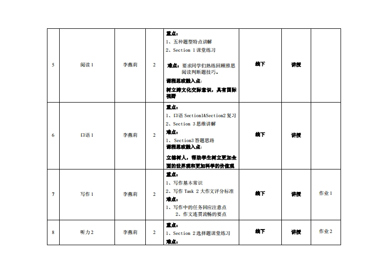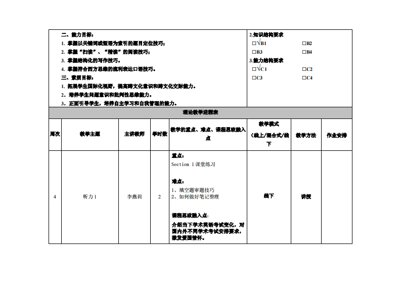 《基础英语一雅思提高)教学大纲课程名称:准思提高课程类别(必体迹修):必修课程英文名称:正LTS总学时周学时学分:322/2其中实验实波学时:0先无修课程:菱裸时间:419周是期五14节授课地点:实406提课对橡:2022事台学陕雅思A班开裸学愧:事合产业科技学洗任课妆师姓名职称:李痛莉答疑时间、地点与方式:课密特核方式:开港()闭卷()课程论文()其它()使用做材:创桥雅思考试全其试温集创桥大学考试委员会输,桥大学出版社,2011。敏学李考责料:《朋文当代高领英语裤典》、网络文津、音源、视须体材料。课和前介:盖减英活雅思是针对大一绳高雅思班的必修课老。此裸产循蓝雅思听力、雅思口活、准思侧读和雅思耳作,主要针对准思中抛圳则,出愿思席,解愿技巧进行高阶讲解,提供模拟试巡,以真为本,带助学生快速掌雅思考试的提分技巧,最大程度带助学生进行淮退提分。本课程采用面发教学模式,具体的微学实我为以学生为主体、以收师为主导、数斯互功性交流,提信自主性训陈,以技巧为主,积累为本,全面提高英活水平,快速提分。本课程敏学以听说读年四个主愿的形式足瑰,喻在培养学生较扎实的英话话言著瑞和较强的英话缘合运用能力,提开学生的做思能力,促进学生应对雅息各类愿型的能力,带助学生薄定国际学术类英语考试的心志。课程妆学目标本课容裸程目标与学生单业要求之间的关联:一、知识目标:1素质结构要求1.掌英话学习积累的高效方法,形成个体同定的学习慎试:口A1OVA22.掌量雅息考试各类愿型的高激佩题技巧。口A3口A4