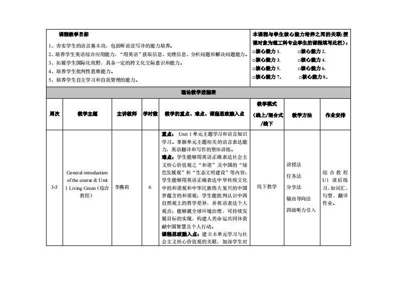 《基础英语1》教学大纲课程名称:盖德英语1课容类别(必体选修):必棒课程英文名称:Basic English 1总学时周学时学分,32/22其中实险实牌学时先他课程:盖德英语1授课时间:3-18周周五8-4节提课地点:实312提课对橡:事台学陕24级基地英语B4班开课学洗:粤合产业科技学洗任课嫩师姓名职称:李痛潮答疑时间、地点与方式:通过课堂面对面答凝,结合通过“优学院”等网络教学平台、微信(QQ》、电子郎件、电话等方式答疑,时间和地点依实际情况灵活处理。课盘考枝方式:开卷()闭卷()课程论文()其它()使用材:全新版大学进阶英语综合教程2(学生用书),范焊,上海外语教育出版社,2017年4月:全新版大学进阶英语视听说教程2,朱晓映等,上海外语教育出版社,2017年4月.敏学事考责料:《D演讲》、《英语写作技巧》、《英汉翻译教程》、《英语四六级听力技巧》课程情介:《基础英语》课程是面向非英语专业学生的一门必修课。该课程以《大学英语教学指南》(2020版)为指导,以英语语言知识与应用技能、跨文化交际和学习策略为主要内容,是各个专业的专业英语课程的基础,也是培养学生人文素质的一门必修课程。结合线上线下混合式教学模式,本课程采用基于活动的英语教学模式,坚持“能力本位、任务驱动、行动导向、教学做一体化”的原则,做到“学中做,做中学”,以达到“学以致用”、“学以管用”的目的。在教学中,倡导任务导向、目标导向教学法,积极鼓局学生参与语言活动,进行愉快学习。本课程从听、说、读、写、译各方面帮助学生提高英语综合应用能力,拓展学生的思维能力,提高学生的跨文化交际能力,独立自主以及合作学习的能力,提升文化修养,培养职业精神与职业技能。