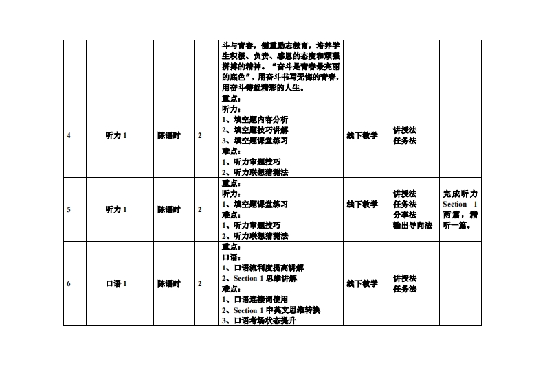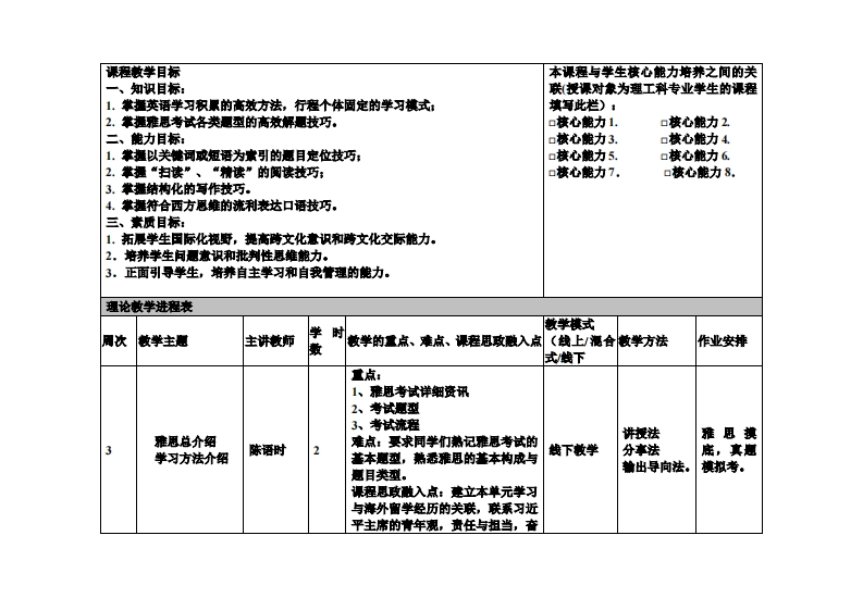《基础英语A》教学大纲课程名称:基础英语A课程类别(必修/选修):必修课程英文名称:Basic English A总学时/周学时/学分:3222其中实验/实践学时先修课程:无裸时间:A13-18周周一7-8A234周、13-18周/周五5-6节5-12周/周五7-8节授课地点:实313/实406视课对像:粤台学院24敏基础英话A1、A2班开课学院:粤台产业科技学院任课敏师姓名/职蒋:陈话时饼师答疑时间、地点与方式:通过课堂面对面答疑,徽信(QQ)、电子邮件、电话等方式答景,时何和地点依实标情况灵活处理。课程考核方式:开卷()闭卷(√)课程论文()其它()使用敢材剑桥准思考试全真试题桌,剑桥大学考试委员会编,剑桥大学出版社,2011。就学渗考资料:《朝文当代高级英语醉卖》、网络文章、音须、视须等村料。课程情介:基础英话雅思是针对大一提高准思班的必修课程。此课程通盖雅思听力、雅思口语、雅思阅读和雅思写作,主要针对雅思命题规则,出题思略,解题技巧进行高阶讲解,提供模拟试题,以真题为本,带助学生快速掌握雅思考试的提分技巧,最大程度帮助半生进行准思提分。本课程采用面视被学慎式,具体的敏学实驶为以学生为主体、以款师为主导、戴师互动性交流,提倡自主性训练,以技巧为主,积黑为本,全面提高英语水平,快速提分。本课程散学以听说读写四个主题的形式呈现,曾在培养学生较扎实的英语语言基础和较强的英语综合运用能力,提升学生的做意能力,促进学生应对雅思各类型的能力,帮助学生稳定国际学术类英语考试的心态。
