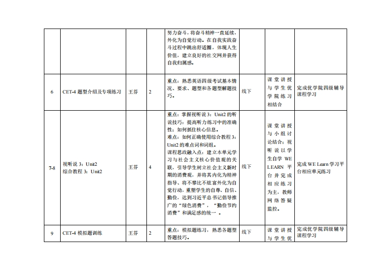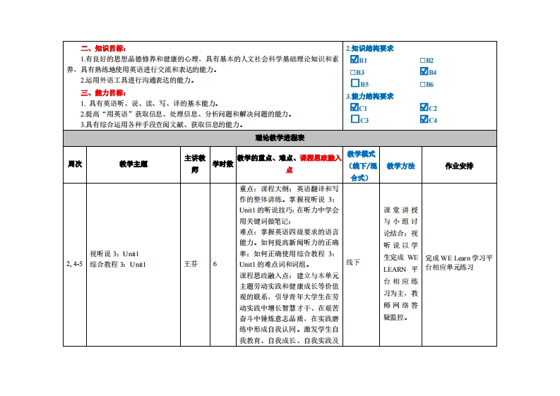 《基础英语2》教学大纲课程名称:基础英语2谋程类别(必修进修),必修课程英文名称:Basic Englis动2总学时周学时学分:32/22其中实验实藏学时。0先修课程:基础英语1数课时间:2,418周周五1-4节提裸地点:实3引4授潭对◆:粤台学院22级基础英语B1、B2班开课学院:粤台产业技学院任课数师姓名京称:王芬/讲师容凝时间、地麻与方式:课堂面对面,结合“优学院”“超星学习通”网络教学平台、微信答疑,时间和地点依实际情况灵活处理。课特核方式:开卷()闭卷()课程论文()其它()使用就材:全新版大学进阶英语综合教程3(学生用书),李荫华,上海外语教育出版社,2017年6月:全新版大学进阶英语视听说教程3,上海外语教有出版社,2017年6月。敏学◆考资料:《英语四六级真愿》、《英语四六级模拟愿》、TD演讲》课容情介:《基础英语》课程是面向非英语专业学生的一门必修课。该课程以外语教学理论为指导,以英语语言知识与应用技能、跨文化交际和学习策略为主要内容,是各个专业的专业英语课程的基础,也是培学生人文素质的一门必修课程。本课程采用在线网络课程与课堂教学相结合的混合式教学模式,考虑新一代学生获取信息知识的习惯和特点,创新教学思想和教学方法,以学生为学习活动的主体。但导小组学习、学生授课,积极鼓励学生参与语言活动,进行榆快学习。并且本课程还践行“微学习”理念,通过微间读、微视频、微写作等微活动,实行形成性评价,通过强调书面测试与口语测试的结合,努力提高课堂效果,从听、说、读、写、译各方面帮助学生提高英语综合应用能力,拓展学生的思维能力,提高学生的独立自主以及合作学习的能力,提升文化修养,培养职业精神与职业技能。课程城学目标:本课程课程目标与学生单业要求之间的关联一、★质目标:1素质结构要求1.热爱祖国,牢固树立正确的世界观、人生观和社会主义核心价值观。☑i☑A22有健康体魄和良好的心理素质,面对环境压力时具有较强的自我调适能力。☑3口A43具有较强的人文素养和科学精神,求真、务实、严谨、勤奋的科学精神。