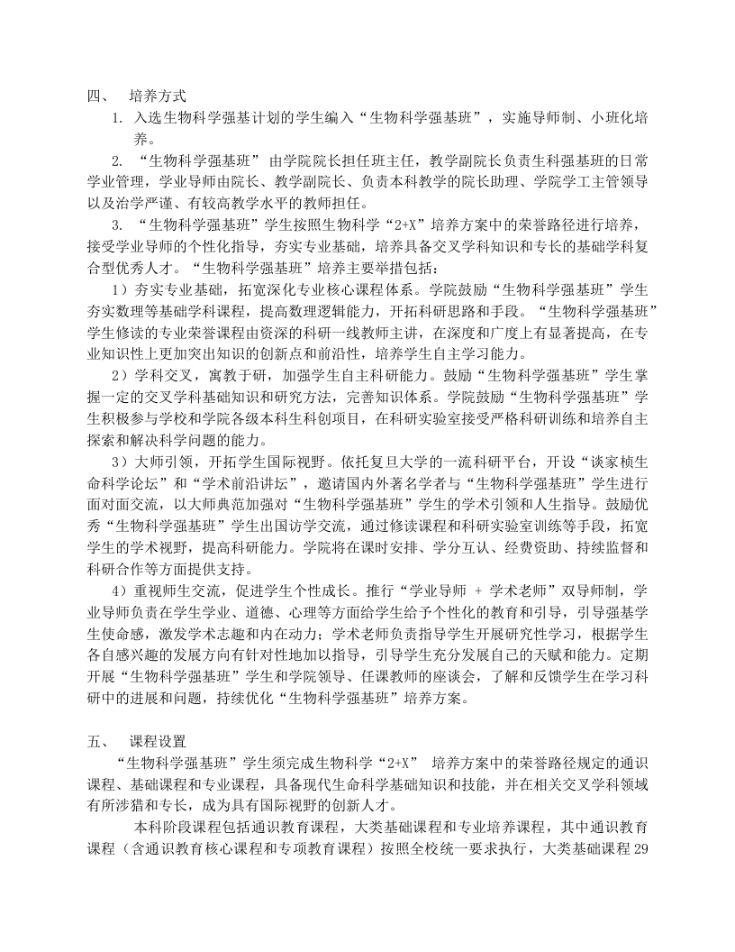 复旦大学生物科学(强基计划)专业培养方案根据《教育部关于在部分高校开展基础学科招生改革试点工作的意见》(教学〔2020)1号)等文件要求,加强基础学科强基计划的招生和培养,制定复旦大学生物科学(强基计划)专业培养方案如下。复旦大学“生物科学强基计划”招收对生命科学有浓厚兴趣,在数理化或者信息科学等方面成绩优良的学生,本科进入生命科学学院生物科学专业就读,按照生物科学“2+X”培养方案中的荣誉路径进行培养,并通过转段在生物化学、生物物理学、遗传学、神经生物学、细胞生物学、发育生物学、生理学、人类学、微生物和免疫学、生物计算、植物科学、动物科学、生态与进化等方向攻读博士学位,培养掌握现代生命科学基础知识和技能,并在相关交叉学科领域有所涉猎和专长,具有全球视野和创新意识,适应未来发展的研究型或应用研究型领军人才。、基本情况1.学院专业简介复旦大学生命科学学院由中国现代遗传学奠基人谈家桢院士创立于1986年,是我国在大学中最早成立的生命科学学院,其前身为1926年设立的生物学系。学院由八个系组成:遗传学与遗传工程系、生物化学与生物物理学系、微生物学与免疫学系、生理学与神经生物学系、生态与进化生物学系、计算生物学系、人类遗传学与人类学系、细胞与发育生物学系:并拥有一个国家重点实验室、一个国家野外科学观测研究站、两个教育部重点实验室。生命科学学院现拥有生物学和生态学两个一级学科博士点和9个二级学科博士点和12个硕士点,设有生物学和生态学两个博士后流动站。生物学和生态学两个一级学科均入选教育部“双一流”学科,生物科学专业和生态学专业均为国家级一流本科专业。复旦大学生命科学学院是国家基础学科拔尖学生培养试验计划2.0的首批入选单位,贯彻落实习近平新时代中国特色社会主义思想和党的十九大精神,坚持以本为本的本科教育培养方针,培养具有良好政治素质和道德修养,综合能力突出,文理功底扎实、具备生命科学和相关交叉学科基础知识,且受到深入严格的科学研究训练,拥有国际视野和创新能力的领军型研究人才。2.师资队伍复旦大学生命科学学院生物科学专业师资力量雄厚,拥有一批学术造诣深厚、治学严谨、教学水平一流的中青年学者,目前共有教授/研究员82名,其中中国科学院院士