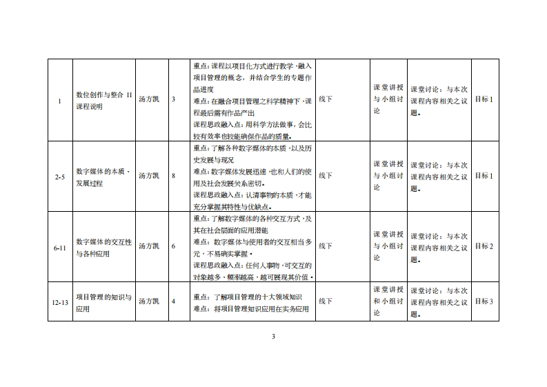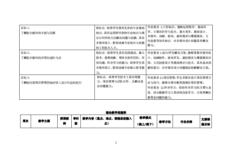 《多媒体项目实作》教学大纲课应名称:多排体项目实作课和类圳(必修选修)·必修课程英文名称:Multimedia Project Implementation总学时周学时学分,48W3/3其中实检实液学时,24先修课塞:后续课程支撑授课时间:1至16周星期二5-7节授课地点:实验楼605机房课对律:2021级多媒体系1班开裸学陕:粤台产业科技学院多媒体设计系任课越柳姓名淋:汤方凯副教授答展时间、地点与方式:实验楼307课程考楼方式:开卷()闭卷()课程论文()其它(√)使用微村,黄海燕等(2016)整合媒体设计数字媒体时代的信息设计·中回建筑工业出版社课程物介:本课程锊引导学生通过参与多媒体项目的实我来掌捍知识,课程的实施将以项目化的方式进行,通过完整地体验项目的各个阶段·并结合课堂上所数授的关键知识点进行学习,让学生柔入理解并精通实施设计项目所需的专业知识和技能,同时将项目管理的方法与精神整合到项目制作过程中·使学生能够随入项目管理的科料学方法管理并优化项目的执行·学生舞有机会展示和评估自己的作品进展并通过反馈确认学习成果·此外,学生也舞被鼓励把作品提交相关竞赛,以此来检验和展示他们的成品·课程放学目标及对华业要求指标点的文排:课老妆学耳标支撑毕业要求指标点单业要求