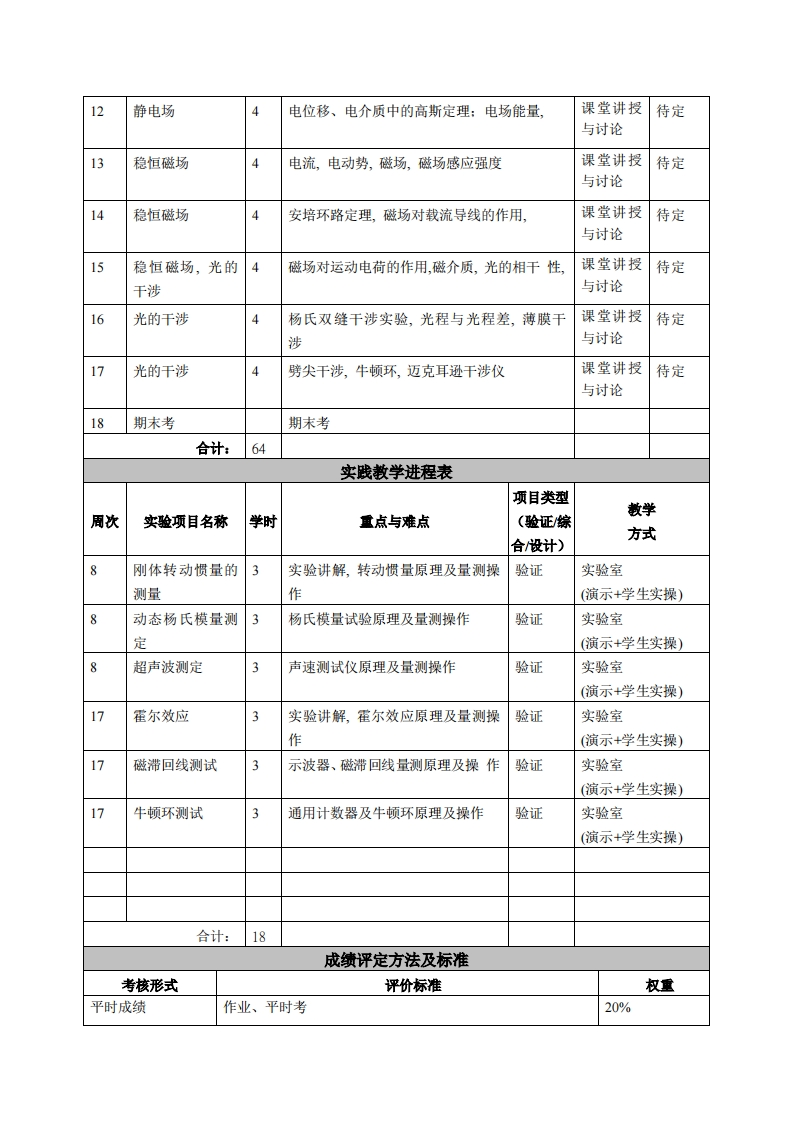 《大学物理》课程教学大纲课程名称:大学物理课程类别(必修/选修):必修课程英文名称:Prineiples of Physics总学时/周学时/学分:64/4/4其中实验/实践学时:18先修课程:高等数学授课时间:周一、二第1,2节授课地点:周一6411,周二6202授课对象:自动化系18级,机械系18级开课学院:粤台产业科技学院任课教师姓名职称:其文皓/副教授答疑时间、地点与方式:周一、二第3节/课堂,实验楼307课程考核方式:开卷()闭卷(√)课程论文()其它()使用救材:赵近芳王登龙编,《大学物理学》(第5版),北京邮电大学出版社,2014年。教学参考资料:Principles of Physics,Halliday,Resnick,Jearl Walkker.张三意主编,《大学基础物理学》,清华大学出版社,2003年;课程简介:大学物理课程是理工类各专业学生一门重要的通识性必修基础课;也是本科生接受工程逻辑思考能力和实验技能训练的开端。该课程所教授的基本概念、基本理论和基本方法是构成学生科学素养的重要组成部分,是每一个高级应用型人才所必备的。大学物理课程在为学生系统地打好必要的物理知识基础,培养学生树立科学的世界观,增强学生分析问唐和解决问题的能力,培养学生科学实验能力,培养学生的探索精神、创新意识、严谨的治学态度、活跃的创新意识、理论联系实际和适应科技发展的综合应用能力等方面,具有其他课程不能普代的重要作用。在大学物理课程的各个教学环节中,在传授知识的同时,应注重学生分析问题和解决问题能力的培养,注重学生探索精神和创新意识的培养,务力实现学生知识、能力、素质的协调发展。课程教学目标本课程与学生核心能力培养之1.求实精神:通过大学物理课程教学,培养学生追求真理的勇气、严间的关联授课对象为理工科专蓬求实的科学态度和刻苦钻研的作风。业学生的课程填写此栏):2.创新意识:通过学习物理学的研究方法、物理学的发展历史以及☑核心能力1.应用数学、基础科学和机械设计制造及其自动物理学家的成长经历等,引导学生树立科学的世界观,激发学生的求化专业知识能力:知热情、探素精神、创新欲望以及敢于向旧观念挑战的精神。3.科☑核心能力2.设计与执行机械学观案和思维的能力:运用物理学的基本理论和基本观点,通过观设计制造及其自动化专业相关实验,以及分析与解释相关数察、分析、综合、演绎、归纳、科学抽象、类比联想、实验等方法据的能力:培养学生发现问题和提出问题的能力,并对所涉及问题有一定深度口核心能力3.机械工程领域所的理解判断研究结果的合理性。需技能、技术以及实用软硬件4.分析问题、研究和解决问题的能力:根据物理问题的特征、性质工具的能力:以及实际情况,抓住主要矛盾,进行合理的简化,建立相应的物理模