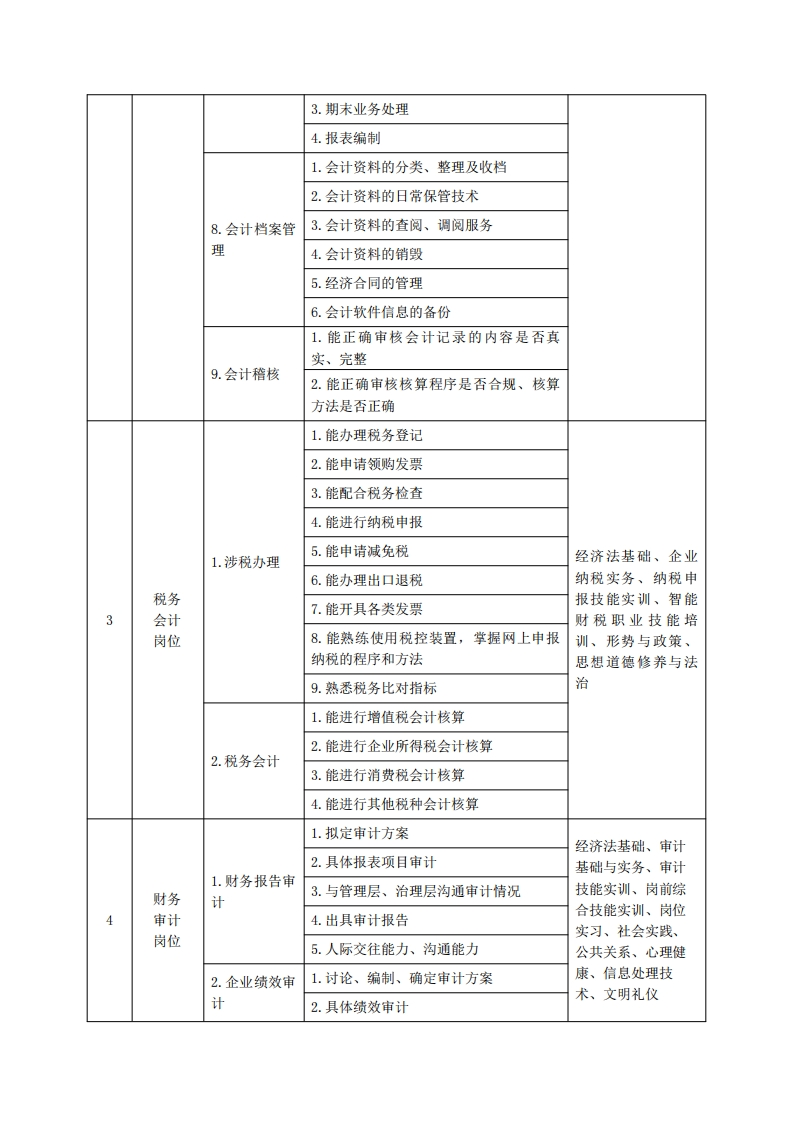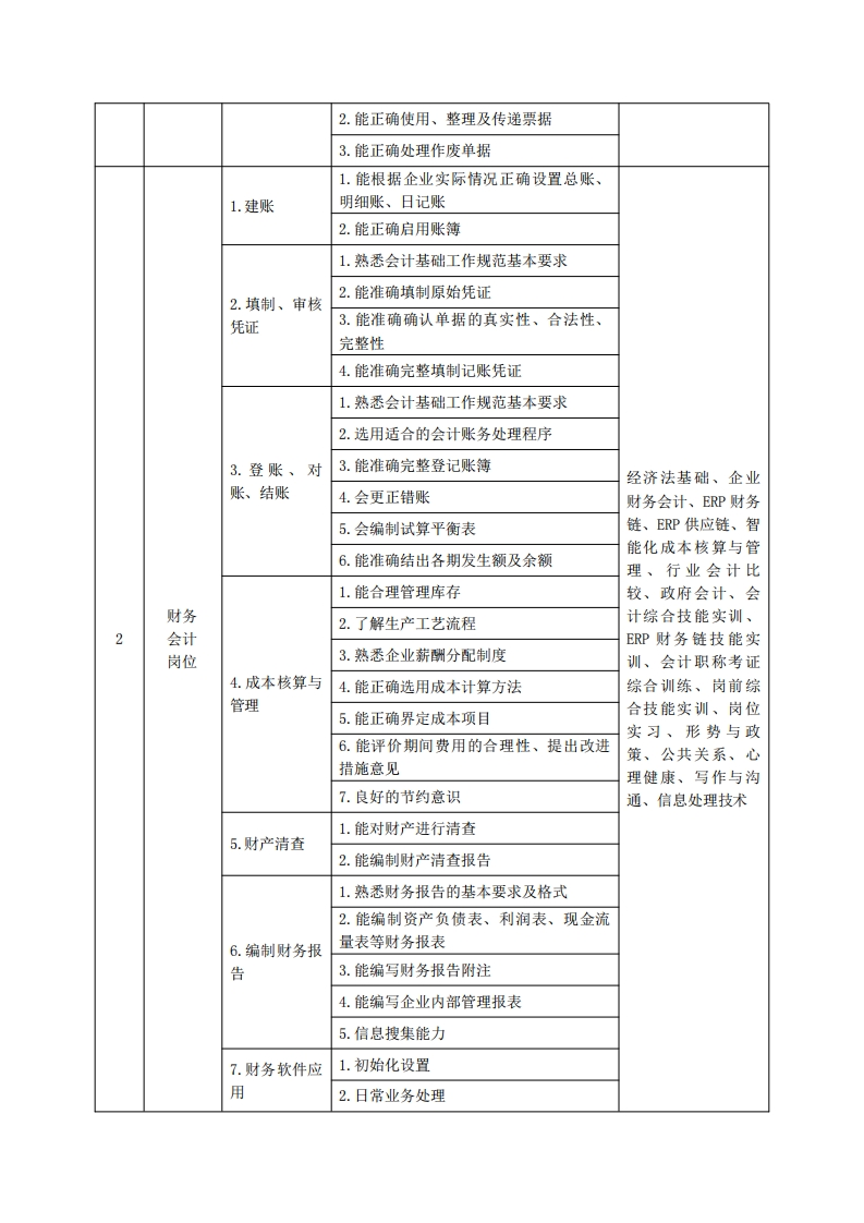 《大数据与会计》专业人才培养方案一、专业名称及代码专业名称:大数据与会计专业代码:530302二、入学要求招生对象:高中(中职)毕业生或具有同等学力者招生类型:文理兼收三、修业年限三年四、职业面向(一)职业能力分析1.专业服务面向本专业培养的学生主要面向企事业单位及代理记账公司、会计师事务所、税务师事务所、管理咨询公司等中介服务机构的会计、审计及税务等岗位(群)就业。培养学生在基层积累多年工作经验后,通过努力取得中、高级专业职称,可提升至会计主管、财务主管岗位从事专业管理工作。同时,培养也面向会计师事务所、代理记账公司、中小型企业财务共享中心、新型财务大数据中心等会计、审计服务中介机构的会计、审计、税务代理、税务鉴证、税务咨询、财务大数据分析等岗位或技术领域。2.职业岗位与职业能力分析序号工作岗位典型工作任务职业能力支撑课程1.能办理现金收、付业务1.办理现金收付2.会盘点现金,编制现金盘点表3.良好的职业道德1.能办理银行结算业务经济法基础、会计基础、会计基本技2.能与银行对账,编制银行存款余额调出纳能实训、岗前综合1岗位节表2.办理银行结技能实训、卫生与3.明辨现金和各种银行结算票据的真伪算安全、文明礼仪、4.能正确处理在货币资金结算过程中出心理健康现的差错5.良好的沟通能力3.管理票据1.能购买、保管票据